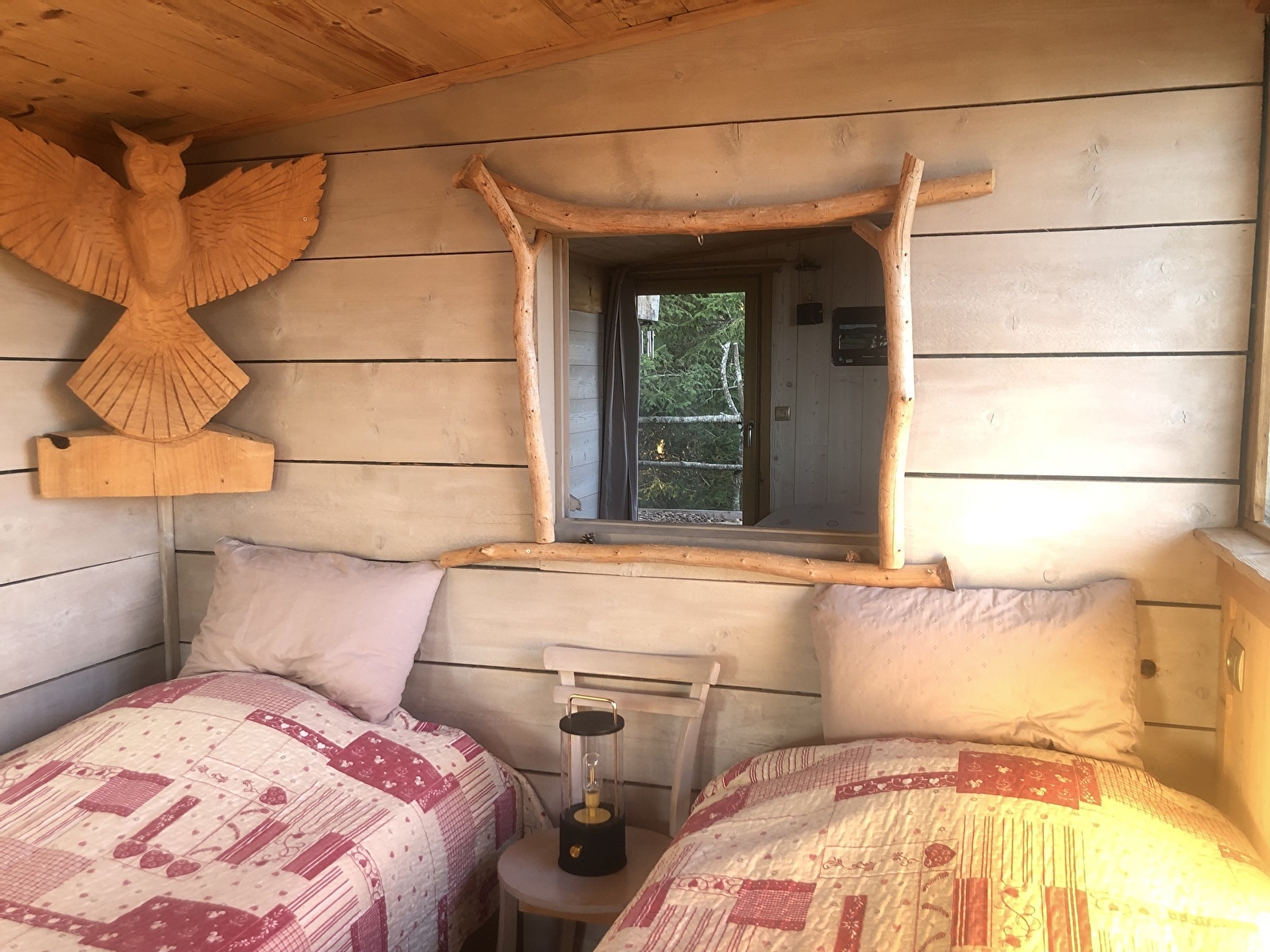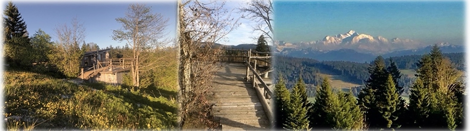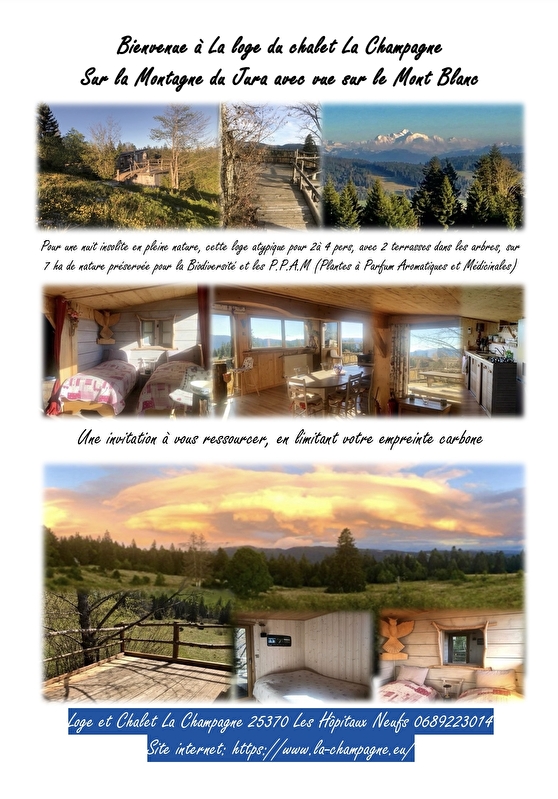 Hoch oben auf dem Berg des französisch-schweizerischen Jura, mitten in den Bäumen auf dem Gelände der Almhütte La Champagne, lädt Sie die Holzloge ein, neue Energie zu tanken und dabei Ihren CO2-Fußabdruck in einem einzigartigen Rahmen auf 7 ha Natur, die für die Biodiversität und die P.P.A.M. (Plantes à Parfum Aromatiques et Médicinales) erhalten wurde, zu begrenzen. Von den beiden Baumterrassen aus haben Sie einen herrlichen Blick auf den Mont Blanc, den Mont d'Or, den Mont Tendre und den Suchet..... Zenit und Tapetenwechsel garantiert! für 2 bis 4 Pers. in Selbstverwaltung mit allem Komfort.