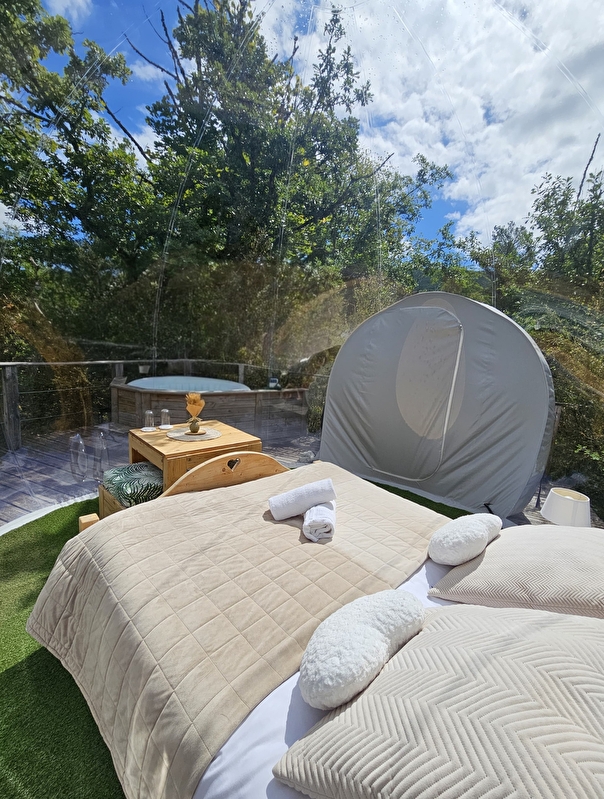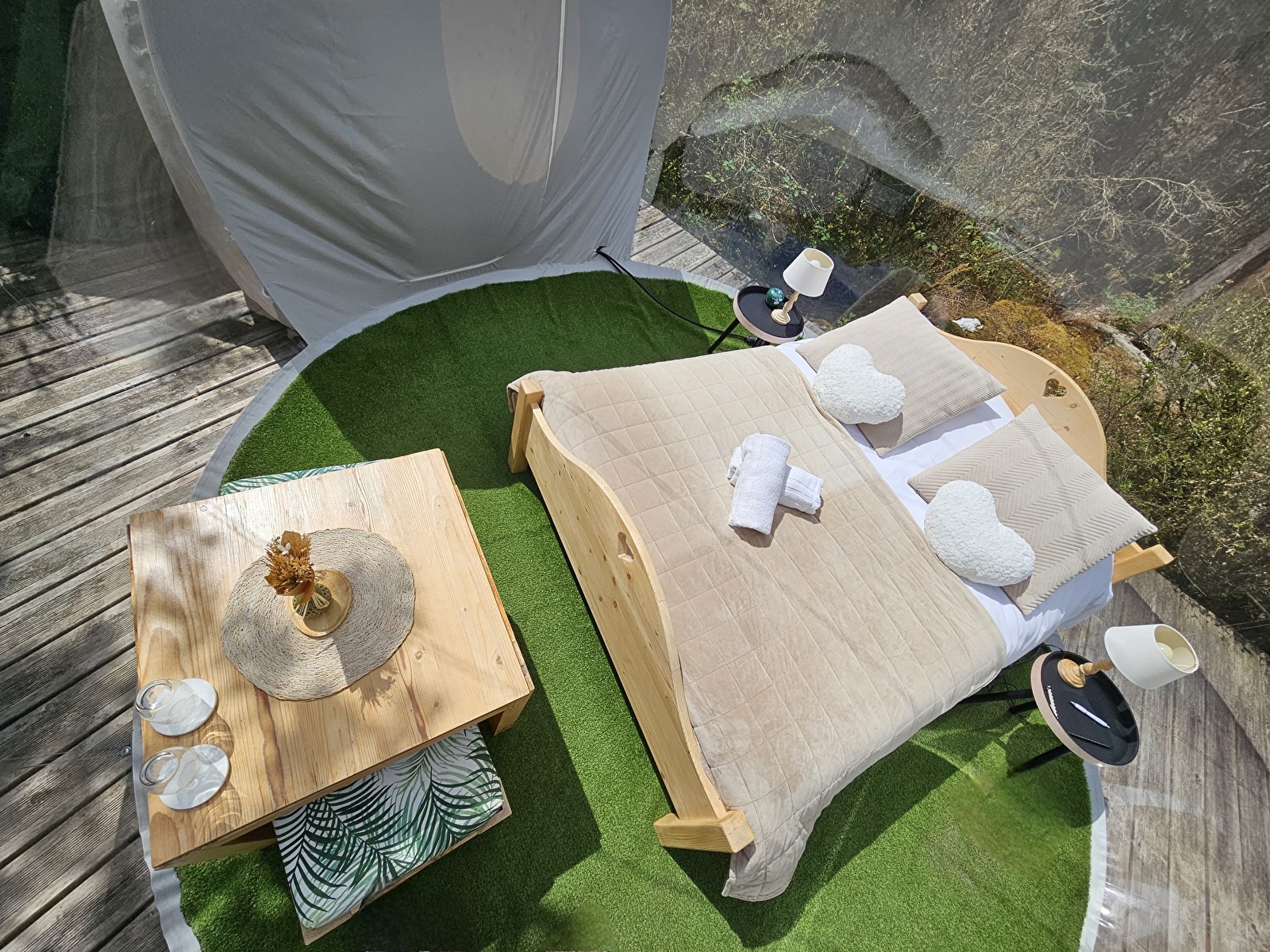 Aufgeblasen auf einer Plattform, die in die Vegetation der Géorennes eingetaucht ist, bieten Ihnen unsere beiden Blasen einen voll ausgestatteten Ruheort mit Tisch und Sitzgruppe im Freien, aber auch mit Trockentoilette und eigenem Badezimmer (Laken, Bettdecke, Kopfkissen, Handtücher und Duschgel stehen Ihnen zur Verfügung).