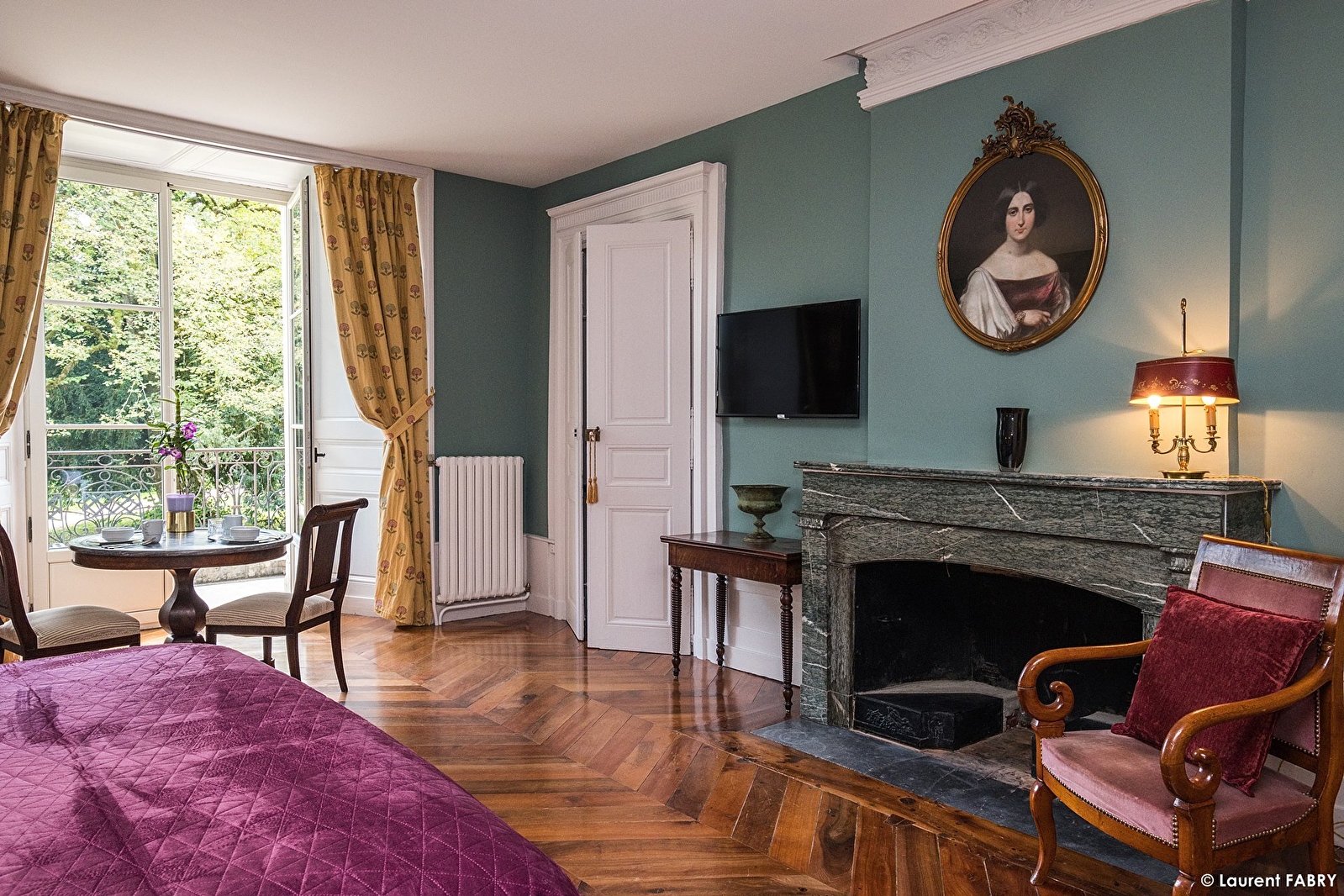Stilmöbel, Parkettböden, Kamine, gemeinsames Wohnzimmer mit Holzvertäfelung im Stil von Louis XV, das sich zu einer Terrasse mit Blick auf die Berge und den Park mit zweihundertjährigen Bäumen öffnet.
