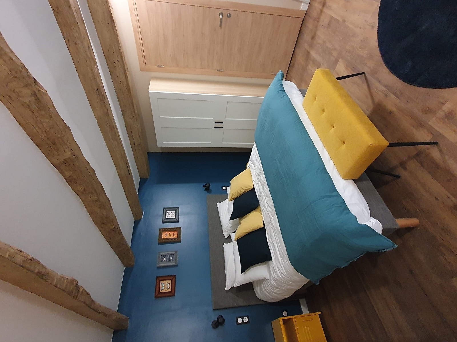 Das Zimmer Indigo spiegelt den Geist der Unterkunft Le Terrier wider: eine Mischung aus Charakter und sorgfältiger Verarbeitung. Die Eigentümer haben jedes Detail der Einrichtung durchdacht und dabei edle Materialien und Texturen bevorzugt, die zum Verweilen einladen.