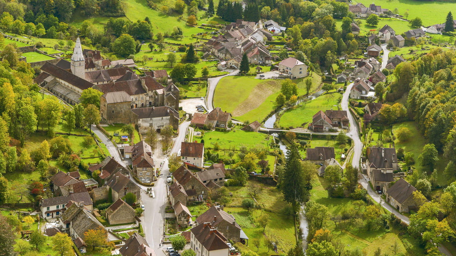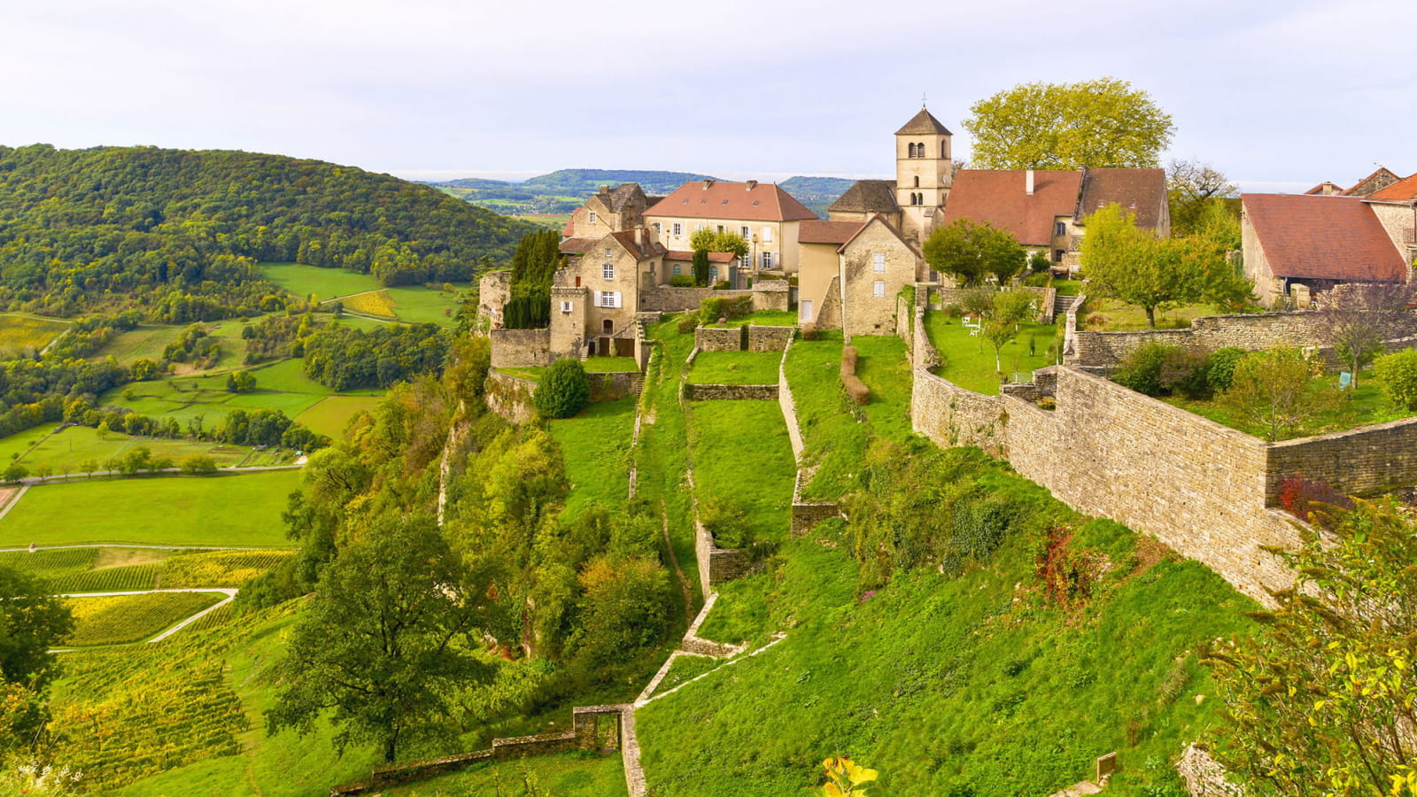 - Château-Chalon, ein Dorf, das auf einem Felsvorsprung liegt und einen jahrhundertealten Weinberg überragt
