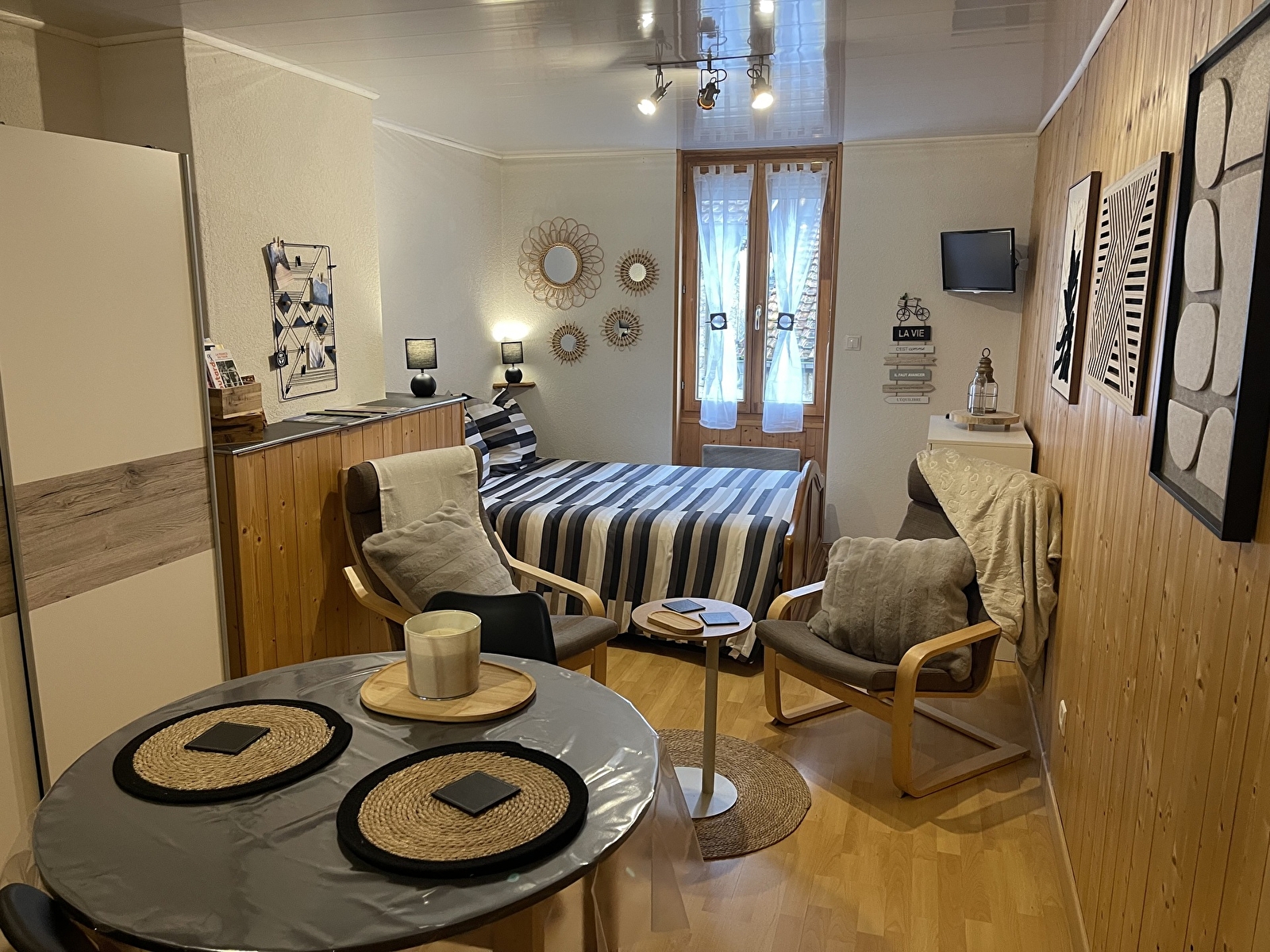 Hall d'entrée - pièce principale avec kitchenette, coin repas, fauteuil et 1 lit 2 pers - salle de bain - wc - chauffage électrique