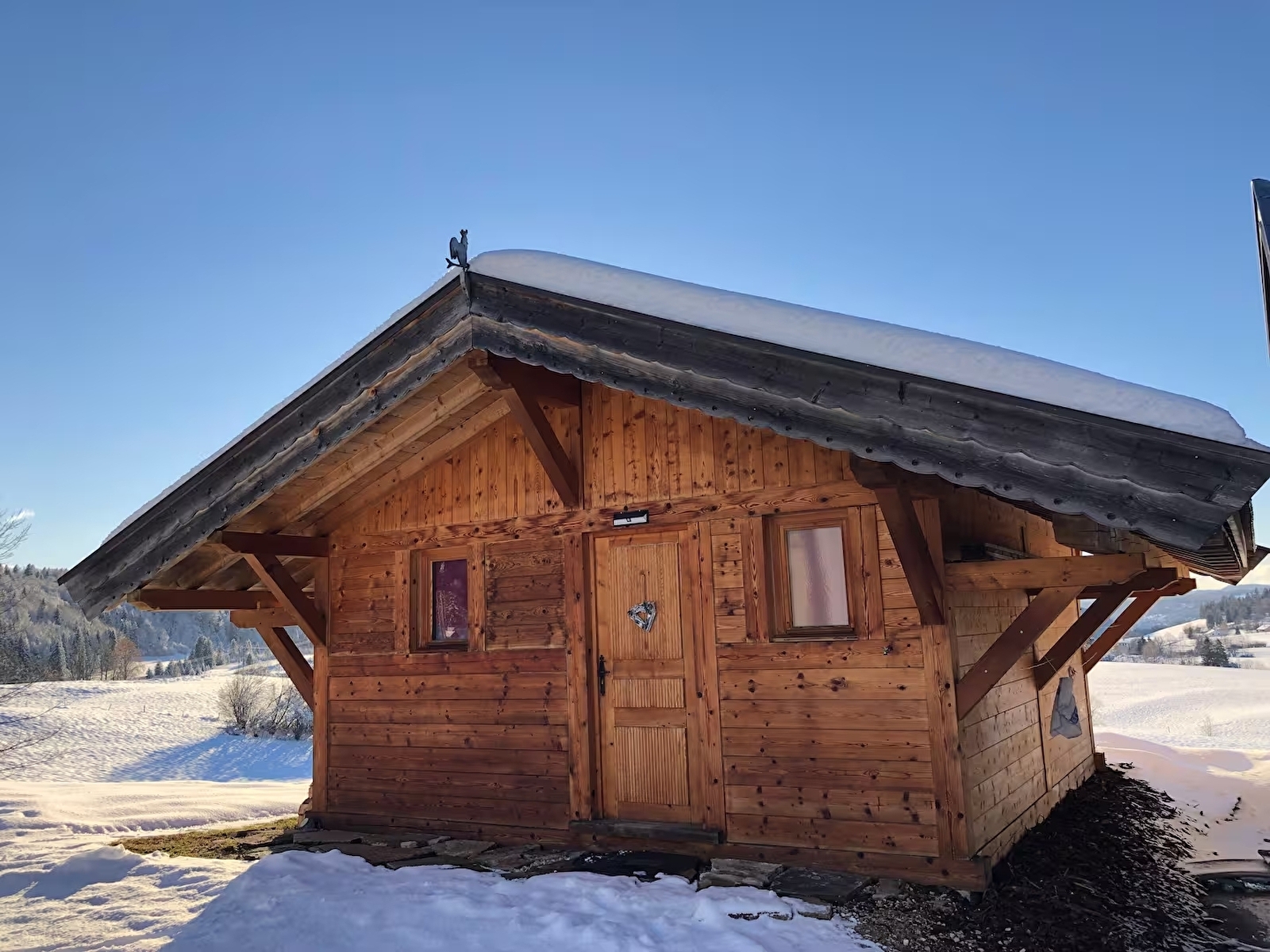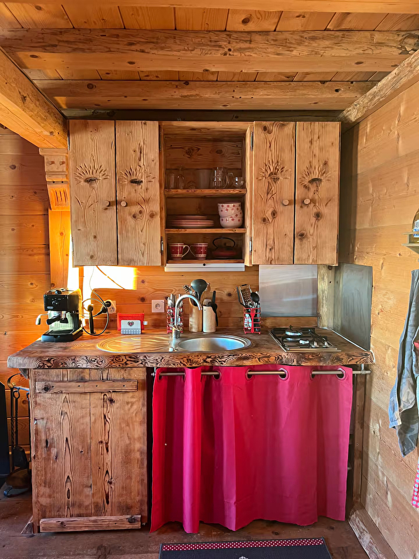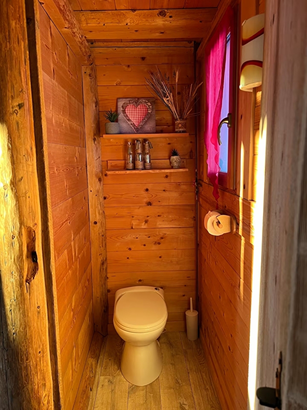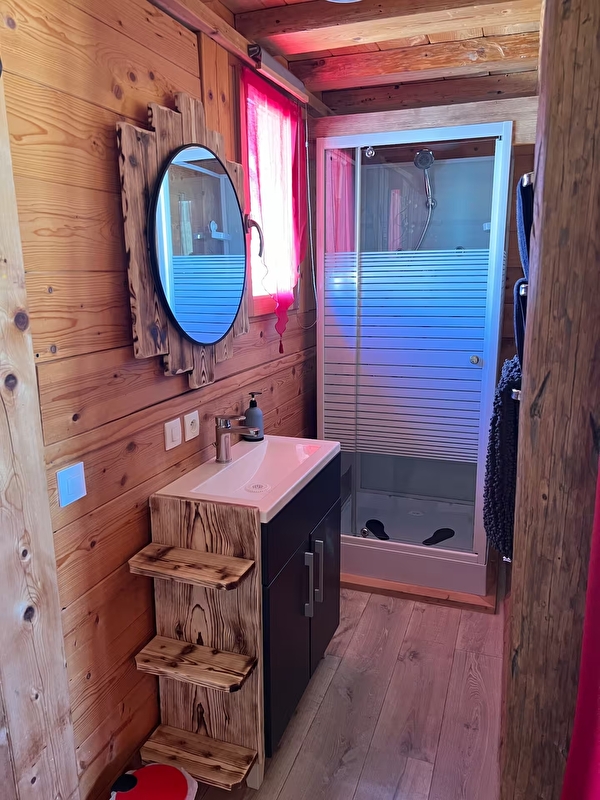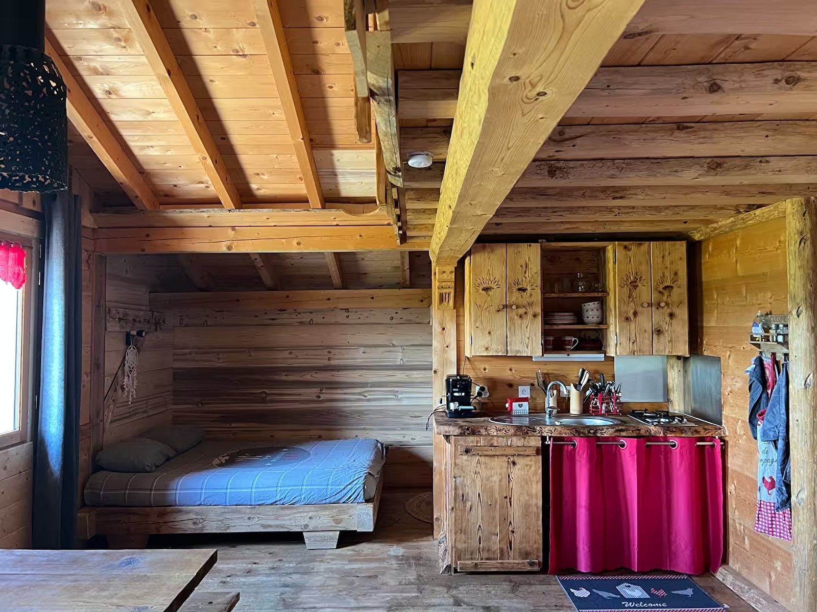 Chalet mit großer Terrasse. Ein 30 m2 großer Raum mit einem kleinen Schrank, einem Tisch, einem Bett 140/200, einem Schlafsofa für 2 Personen (140x200), einem großen Fernseher und einem Kleiderschrank. Badezimmer mit Dusche und Waschbecken, separate Toilette. Bettwäsche, Handtücher und Geschirr werden gestellt.