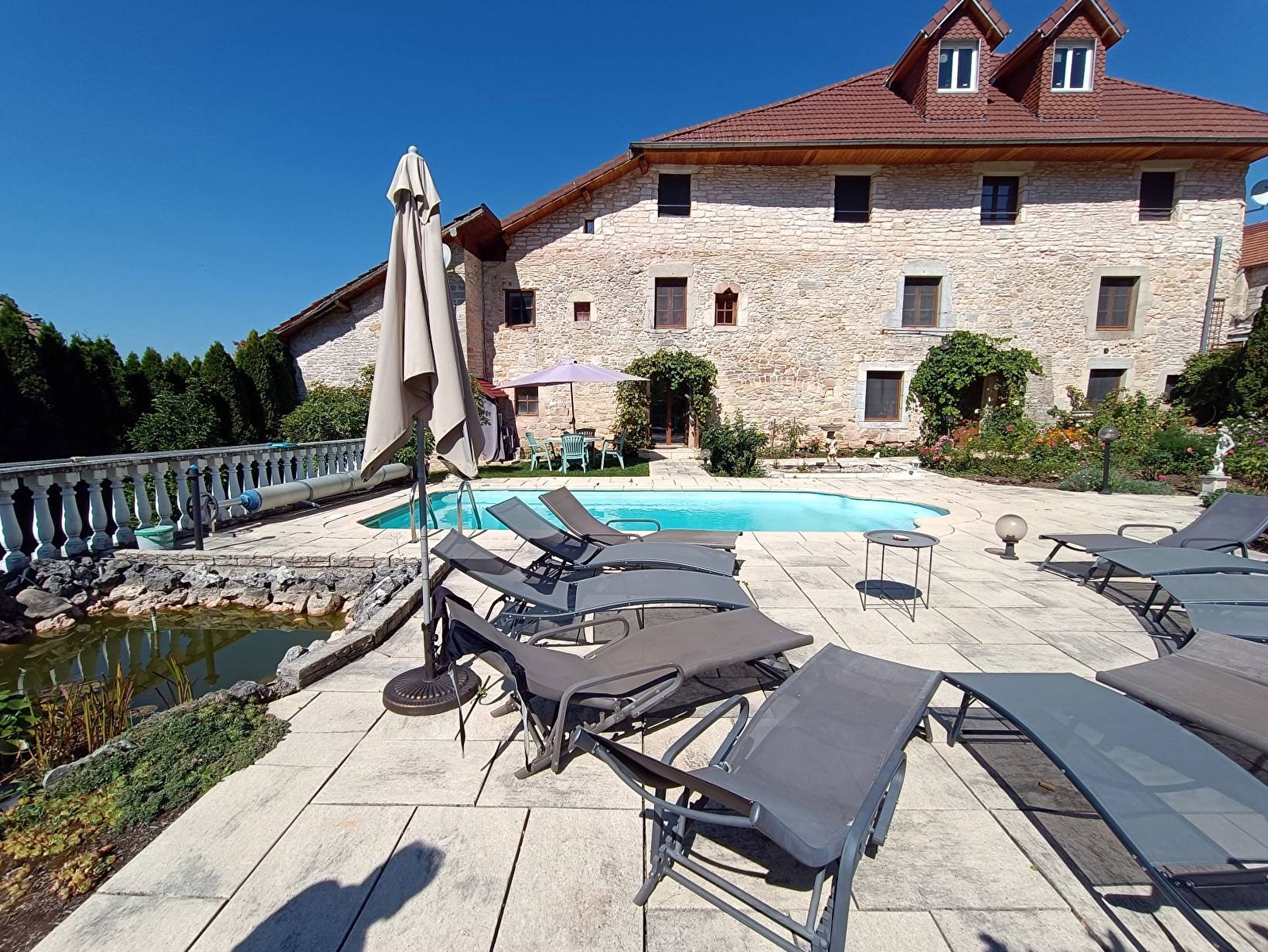 Im Herzen des Juramassivs bietet dieses elegante, raffiniert restaurierte Herrenhaus aus dem Jahr 1786 einen außergewöhnlichen Rahmen zwischen Besançon und der Schweiz. In einer friedlichen Atmosphäre profitieren Sie von einem Wellnessbereich, einem großen Park mit Bäumen und einem Swimmingpool für einen Aufenthalt, der Charme, Gelassenheit und Komfort vereint.