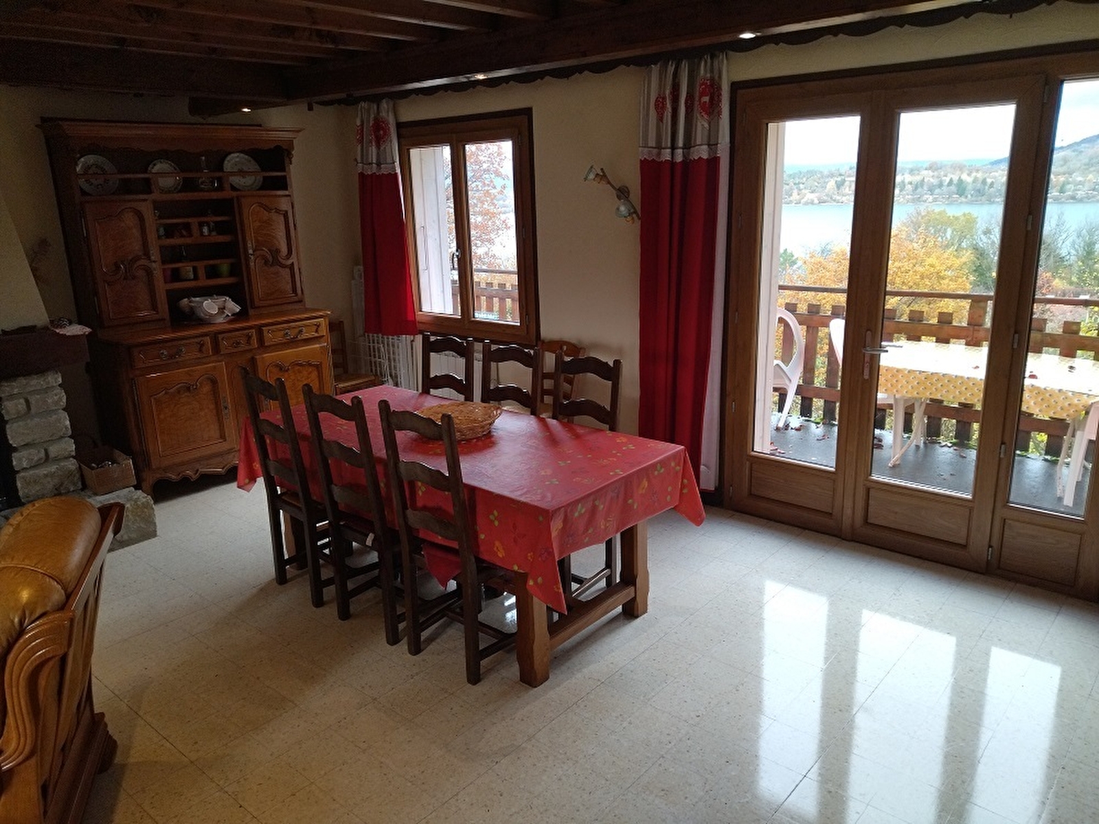 Unabhängiges Haus im Stil eines Chalets am Ufer des Sees von Chalain. Im Erdgeschoss: großer Wohnraum bestehend aus einem Wohnzimmer mit TV, Kamin, Esszimmer und ausgestatteter Küche, ein Badezimmer mit Hydrotherapie-Dusche und ein separates WC. Obergeschoss: Mezzanin mit Schlafsofa für 2 Personen, Badezimmer mit Whirlpool, Schlafzimmer 1: 2 Etagenbetten, Schlafzimmer 2: 1 Doppelbett 160 cm, Schlafzimmer 3: 1 Doppelbett 160 cm (auf Anfrage in 2 Betten von 80 cm teilbar) und ein separates WC. Angrenzendes geschlossenes Grundstück mit Gartenmöbeln und Grill im Sommer, Hof und großer Balkon mit herrlichem Blick auf den See. Geschlossene Privatgarage. Strom: 15 kw/Tag gratis. PREISE PRO TIER: 4.5€ pro Tag.
