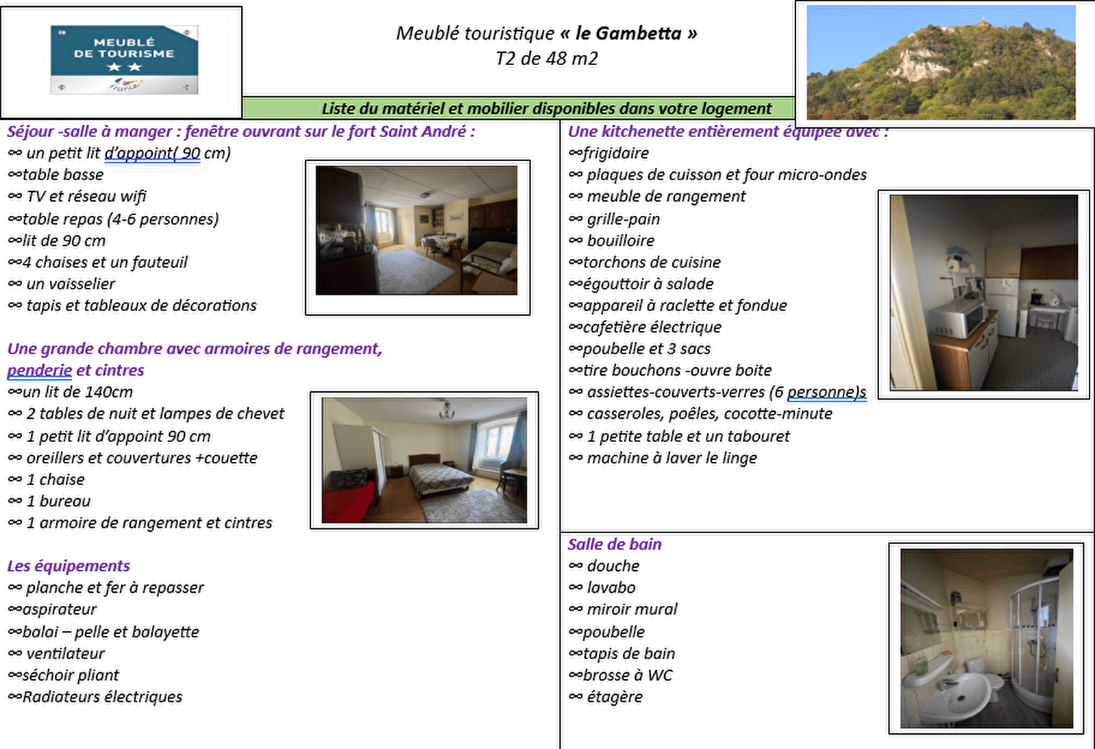 Die möblierte Wohnung "Gambetta" ist eine helle Wohnung für 3 Personen mit freiem Blick auf das Fort Saint André. Sie verfügt über ein geräumiges Wohnzimmer mit einem 90 cm breiten Zusatzbett, ein geräumiges Schlafzimmer mit einem 140 cm breiten Bett und Stauraum. Die Küchenzeile ist funktional und sehr vollständig. Sie befindet sich im dritten Stock und ist mit einem Treppenlift auf den ersten beiden Ebenen zugänglich.