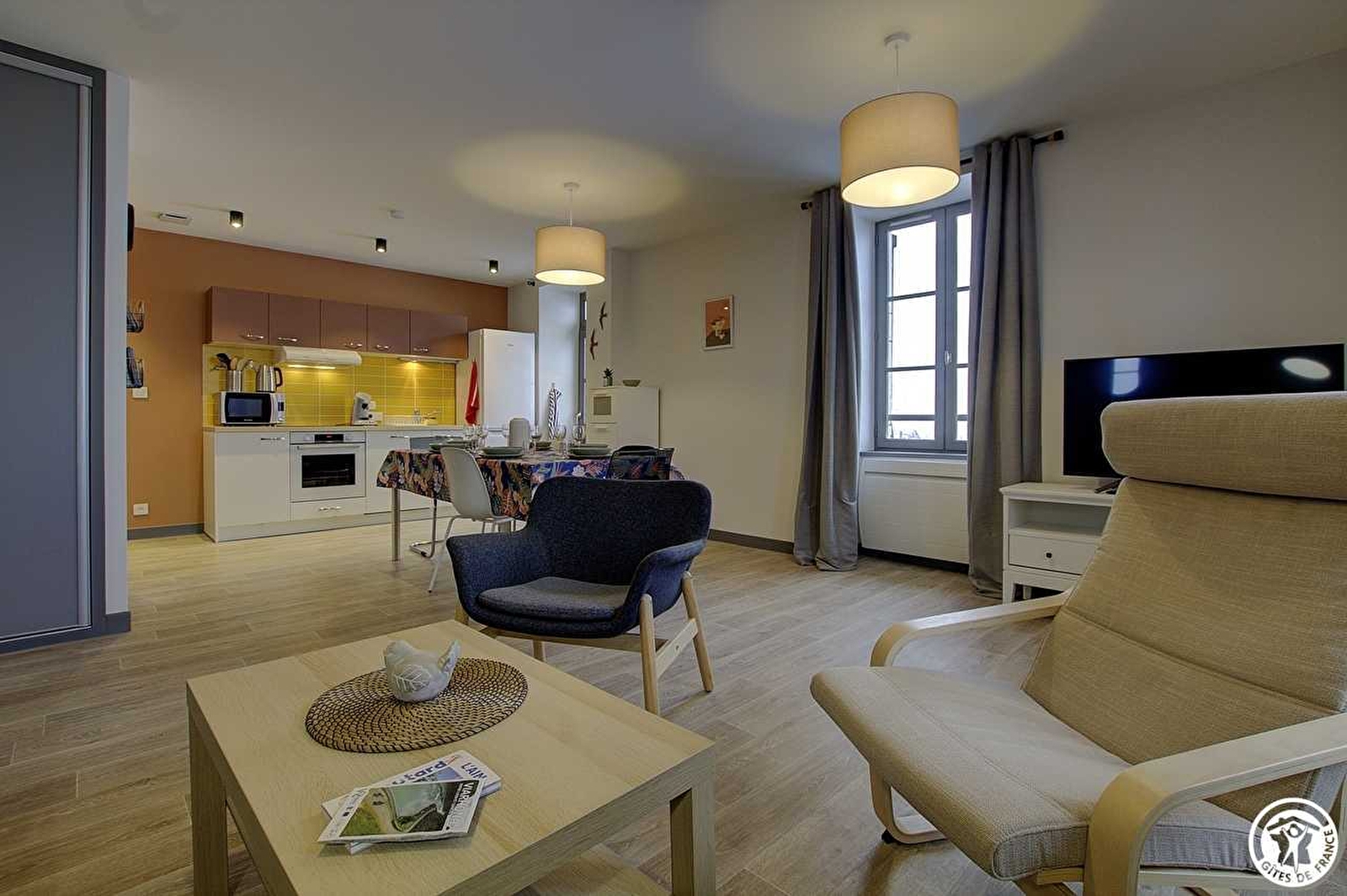Über eine Innentreppe führt der Haupteingang der Unterkunft in eine voll ausgestattete Küche, die zum Wohnzimmer mit Sitzecke und einem kleinen Balkon hin offen ist. Drei Schlafzimmer bilden diese Wohnung: zwei Schlafzimmer mit je einem Bett (140x200) und ein Schlafzimmer mit zwei einfachen Etagenbetten (90x200) sowie einem Babybett.