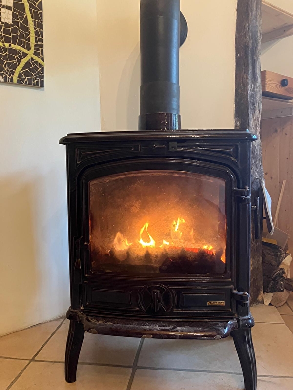 Ein großer Raum von 65 m² mit einem Essbereich und einer Sitzecke mit Sofa, Holzofen und Fernseher.