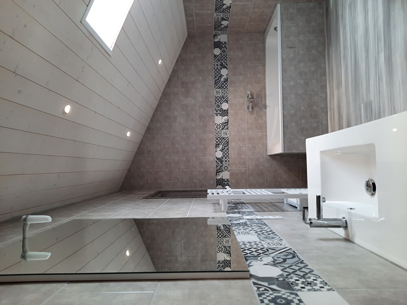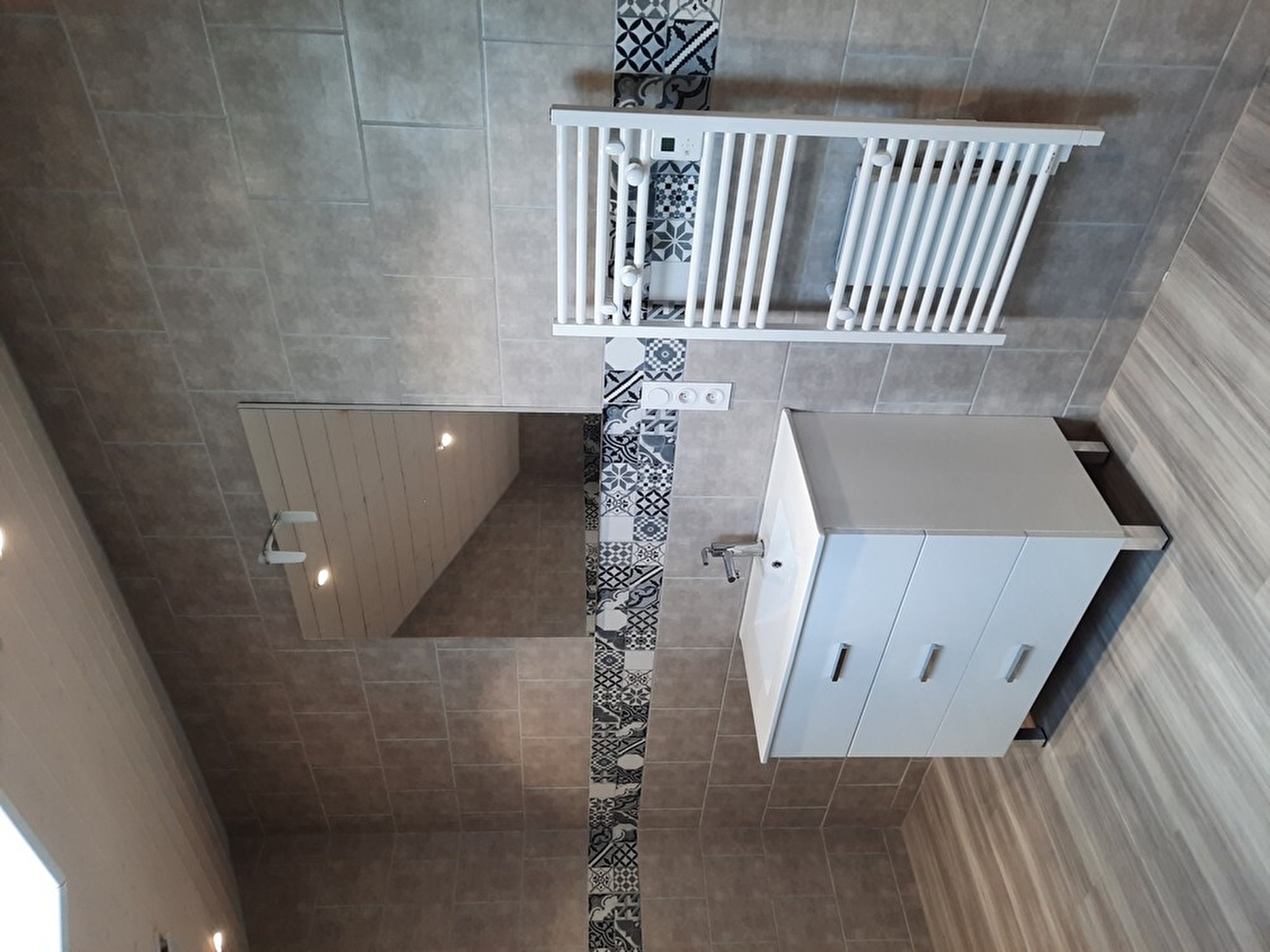 Großes Badezimmer mit Badewanne, WC, Waschmaschine und Trockner. Angrenzendes Grundstück, um die schönen Tage zu genießen, ausgestattet mit Gartenmöbeln, Liegestühlen und Grill.