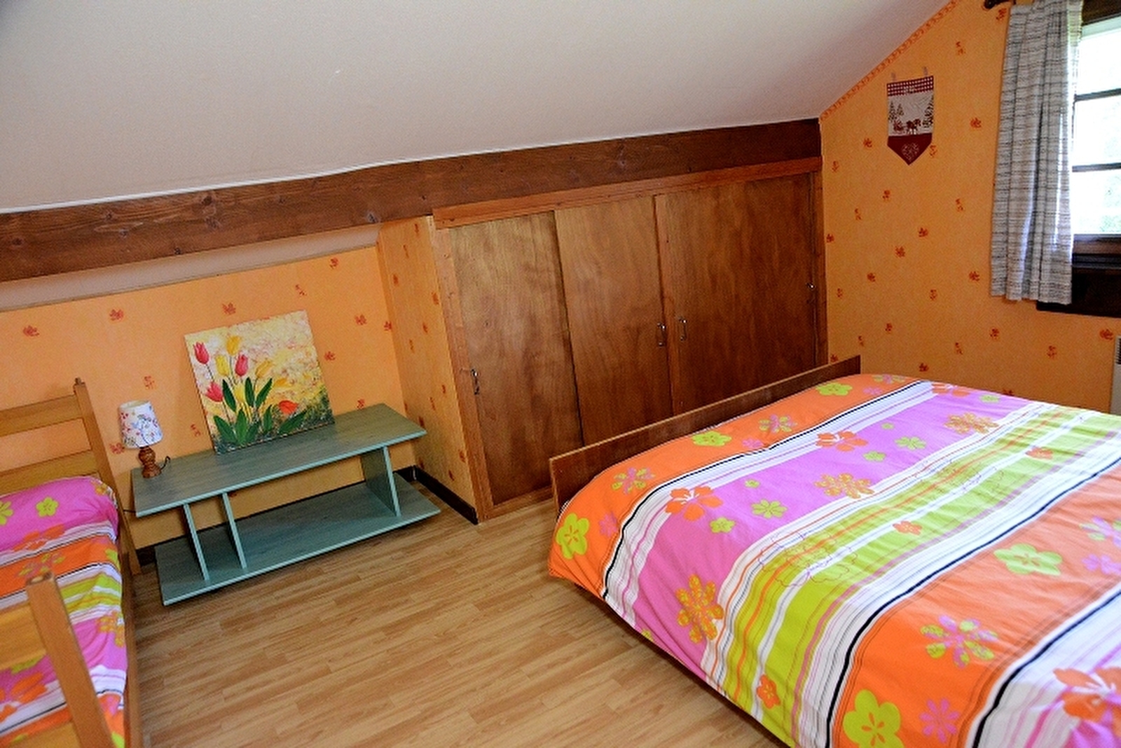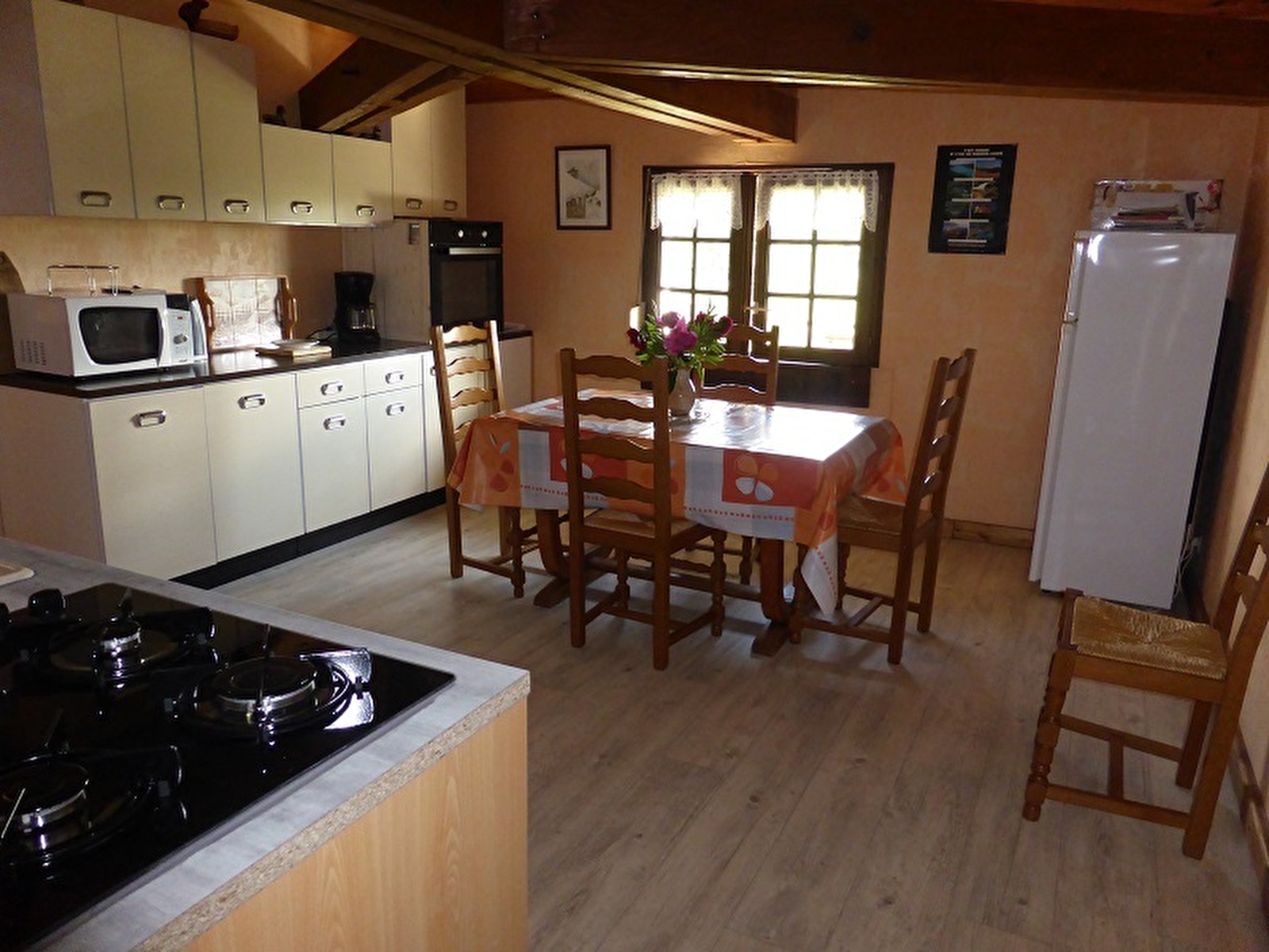 Logement à l'étage de la maison des propriétaires où se trouve un autre gîte. Cuisine-séjour, salle d'eau, ch1: 1 lit 2 pl, 1 lit 1 pl, ch2: 1 lit 2 pl, prise TV, terrain attenant clos, cour, salon de jardin, barbecue. Chauffage électrique. Charges non comprises. Option ménage: 30€.