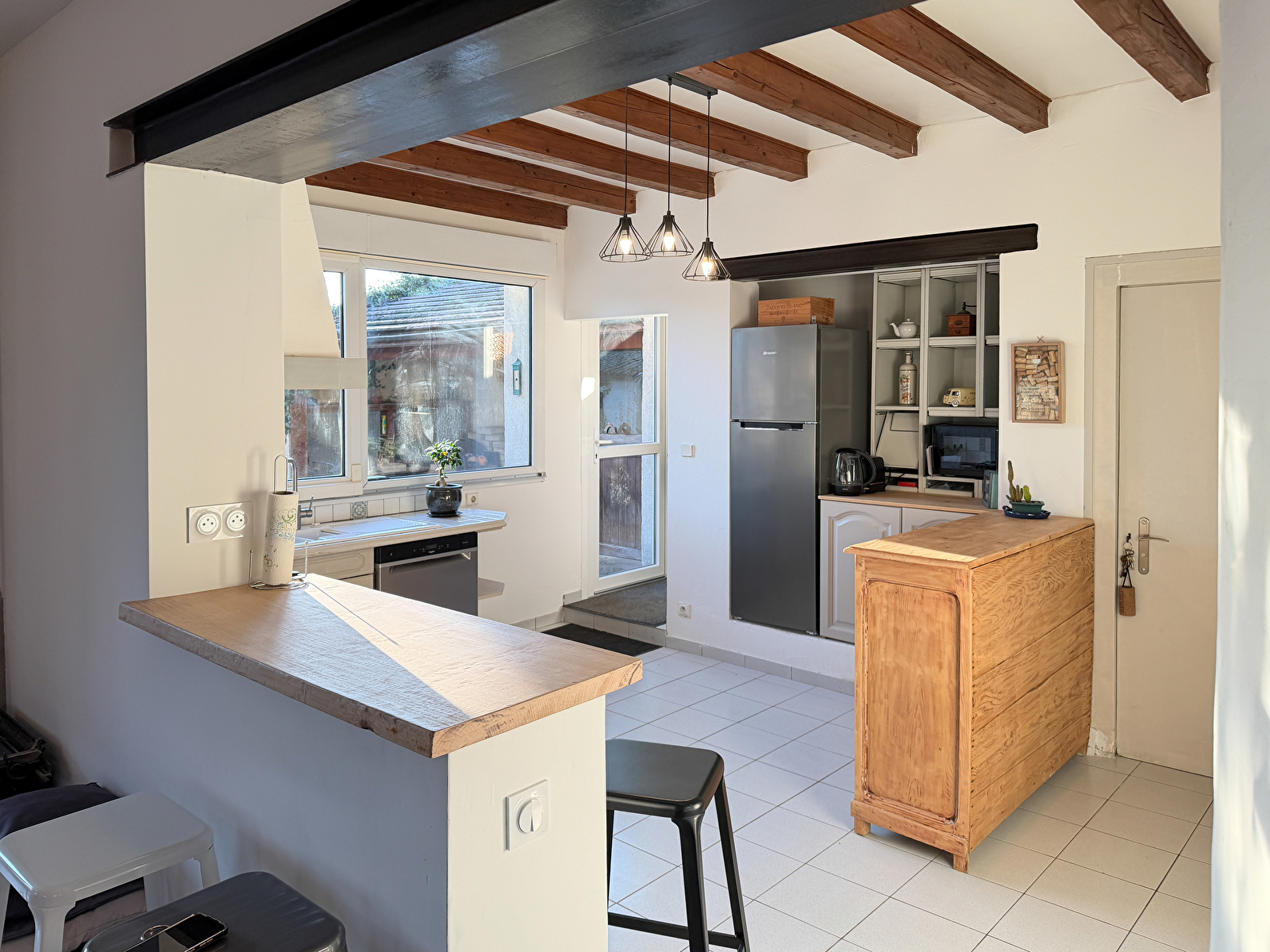 Das Erdgeschoss umfasst eine voll ausgestattete Küche mit einem neuen Kühlschrank, einen großen Wohnraum (Kamin, Billardtisch...), ein Badezimmer, ein WC, ein Büro sowie ein Schlafzimmer mit Doppelbett (mit einer Stufe erreichbar).