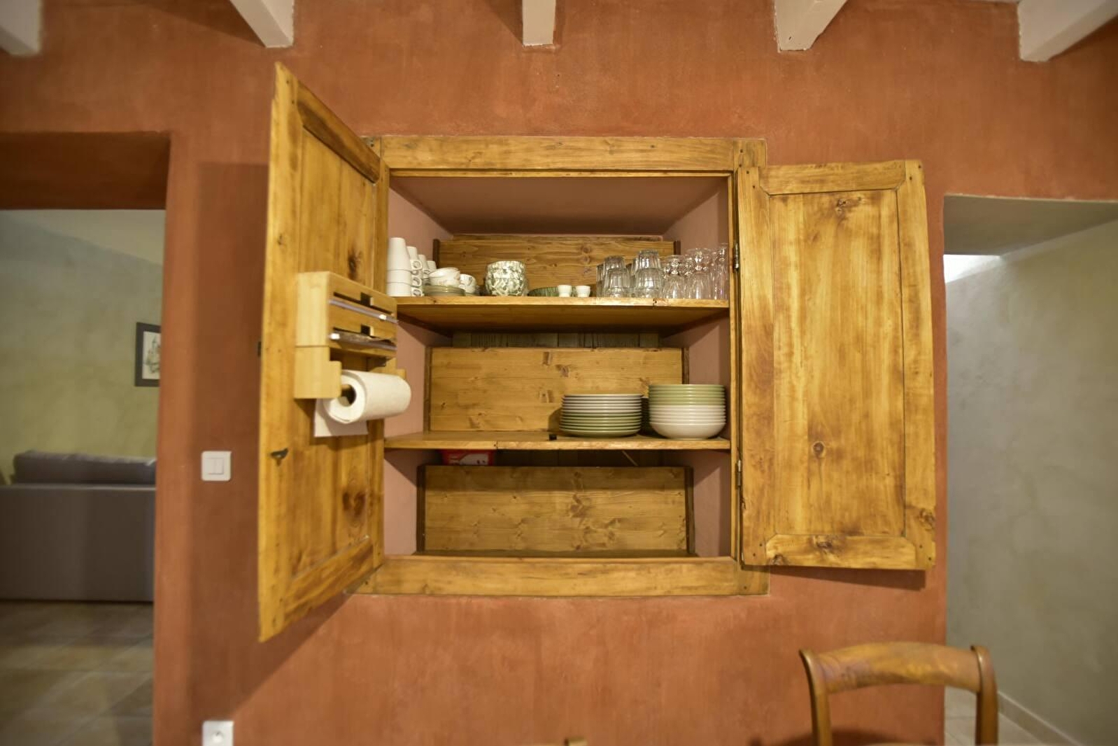 Die Kombination aus Stein, Holz und der Verwendung verschiedener Kalkputze (Tünche, Tadelakt und "a fresco"-Putz) verleihen diesem gemütlichen Nest eine warme Atmosphäre. In jedem Raum wurde viel Wert auf Details gelegt. Im Wohnzimmer können Sie zum Beispiel den alten Wandschrank des Bauernhauses bemerken. Beachten Sie auch die alten Steine der Ställe, die als dekorative Elemente erhalten wurden...