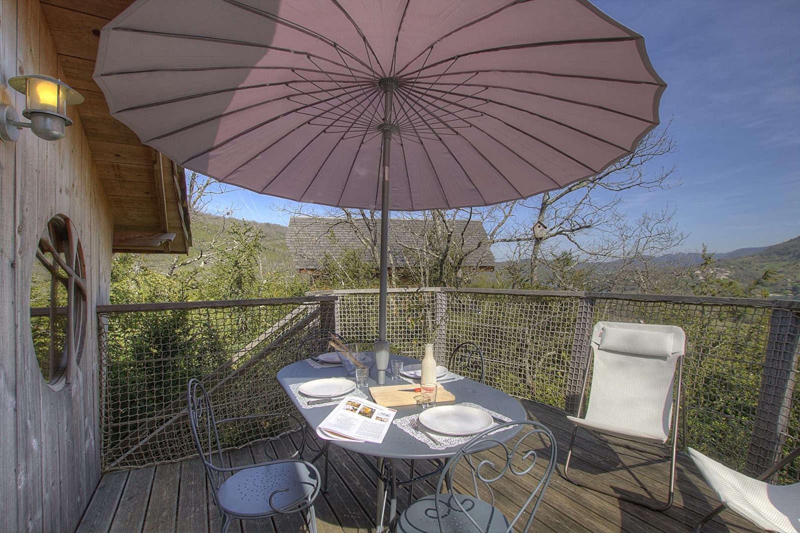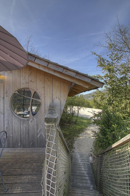 Bei Ihrer Ankunft erwartet Sie eine große, sichere Holztreppe, die Sie hinaufsteigen müssen, um auf die 15 m² große Terrasse zu gelangen, die fast so groß wie die Hütte ist. Die rechteckige Terrasse erhebt sich stolz in ihrer grünen Umgebung und blickt auf den Fluss Ain.