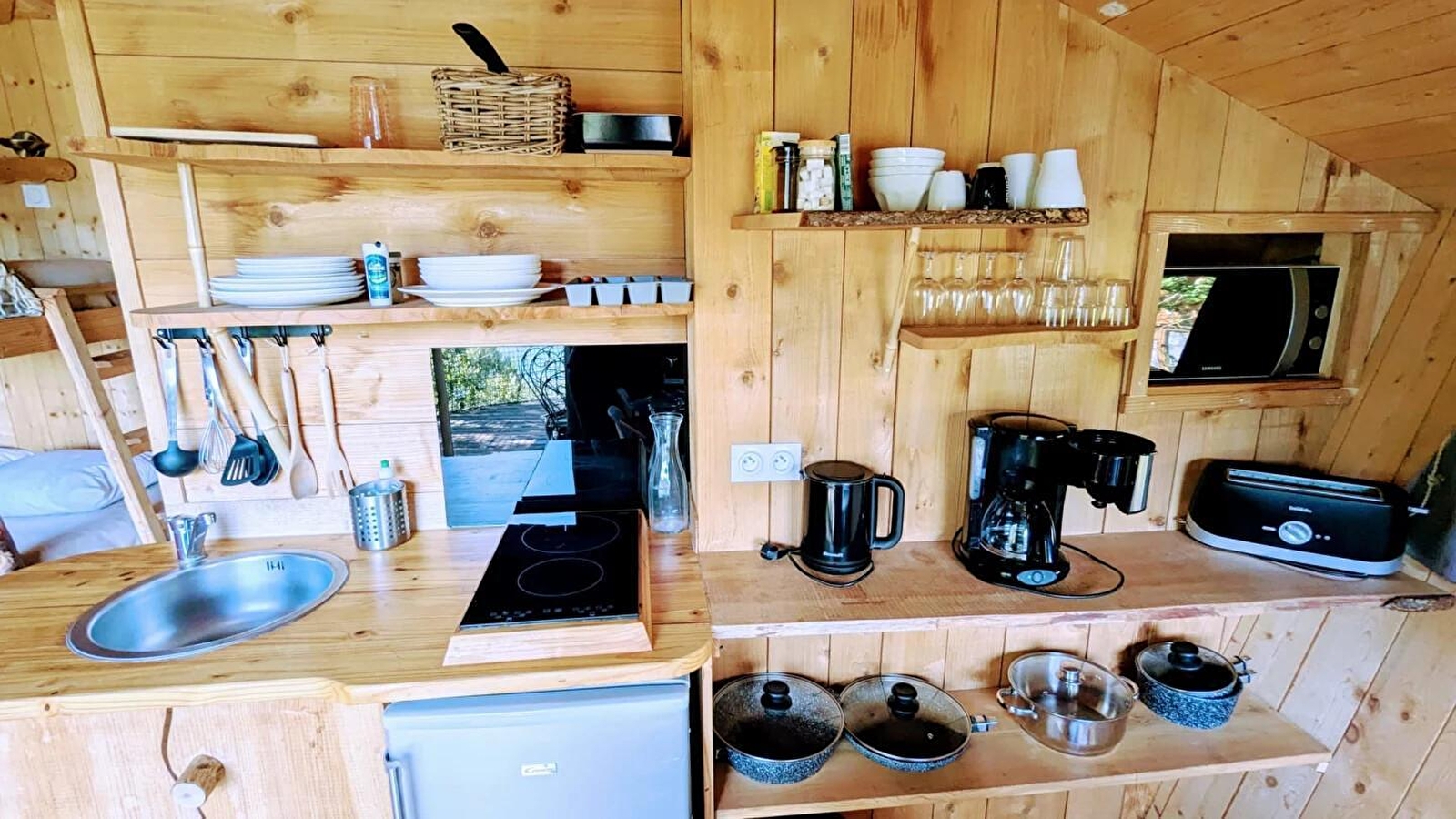 Die Terrasse ist der aufgehenden Sonne ausgesetzt und wird bis 14 Uhr von der Sonne beschienen. Das Innere der Hütte ist durch eine Glaswand abgetrennt und besticht durch seine drei Bereiche: Auf der rechten Seite befindet sich ein Essbereich mit einer Küchenzeile (2 Keramikkochfelder, 1 Kühlschrank, 1 Mikrowelle) und einem anisgrünen Gartentisch. Hinten befindet sich ein sichtbarer Schlafbereich mit dem Etagenbett (90 cm) mit Schutznetzen, links vom Eingang ein "unsichtbarer" Schlafbereich für 2 Personen, der es ermöglicht, den Raum zu nutzen, wenn das Bett in den vorgesehenen Rahmen eingeklappt wird. Der Zugang zum Badezimmer/WC befindet sich am Ende des Hauptwohnraums.Bei Ihrer Ankunft wird Ihnen ein Kit mit den wichtigsten Produkten ausgehändigt. Unser Favorit: Die außergewöhnliche Innen- und Außensicht, die geniale Anordnung dieser Hütte, die Backbord-/Steuerbord-Atmosphäre, die sie mit ihrem riesigen Bullauge über dem Essbereich, den Netzen, die die Terrasse und die Etagenbetten umrahmen, und ihrer entspannenden Harmonie aus Holz ausstrahlt. Le Chenaie ist Teil eines Naturparks mit insgesamt 7 Hütten und Lodges, die vollständig in den Buchsbaumwald integriert sind, der sich auf den Höhen von Serrières sur Ain oberhalb des Flusses Ain befindet. Jede Hütte hat ihre eigene Identität und ist auf Stelzen in 2 m Höhe über dem Boden gebaut, die Zugänge und die Terrasse sind vollständig gesichert. Ein außergewöhnlicher Ort in den Schluchten des Ain, der zum Kanufahren, Rudern oder einfach zum Baden einlädt. -10% auf Aufenthalte von 4 Nächten von Montag bis Donnerstag (außer vom 01/07 bis 31/08/2019)
