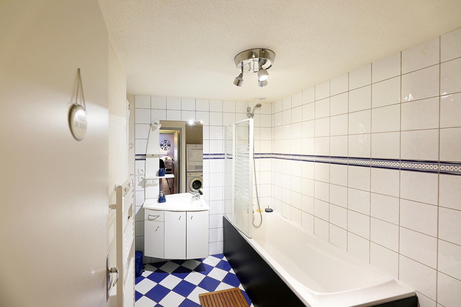 - Badezimmer mit Badewanne, ausgestattet mit Waschmaschine und Wäschetrockner,