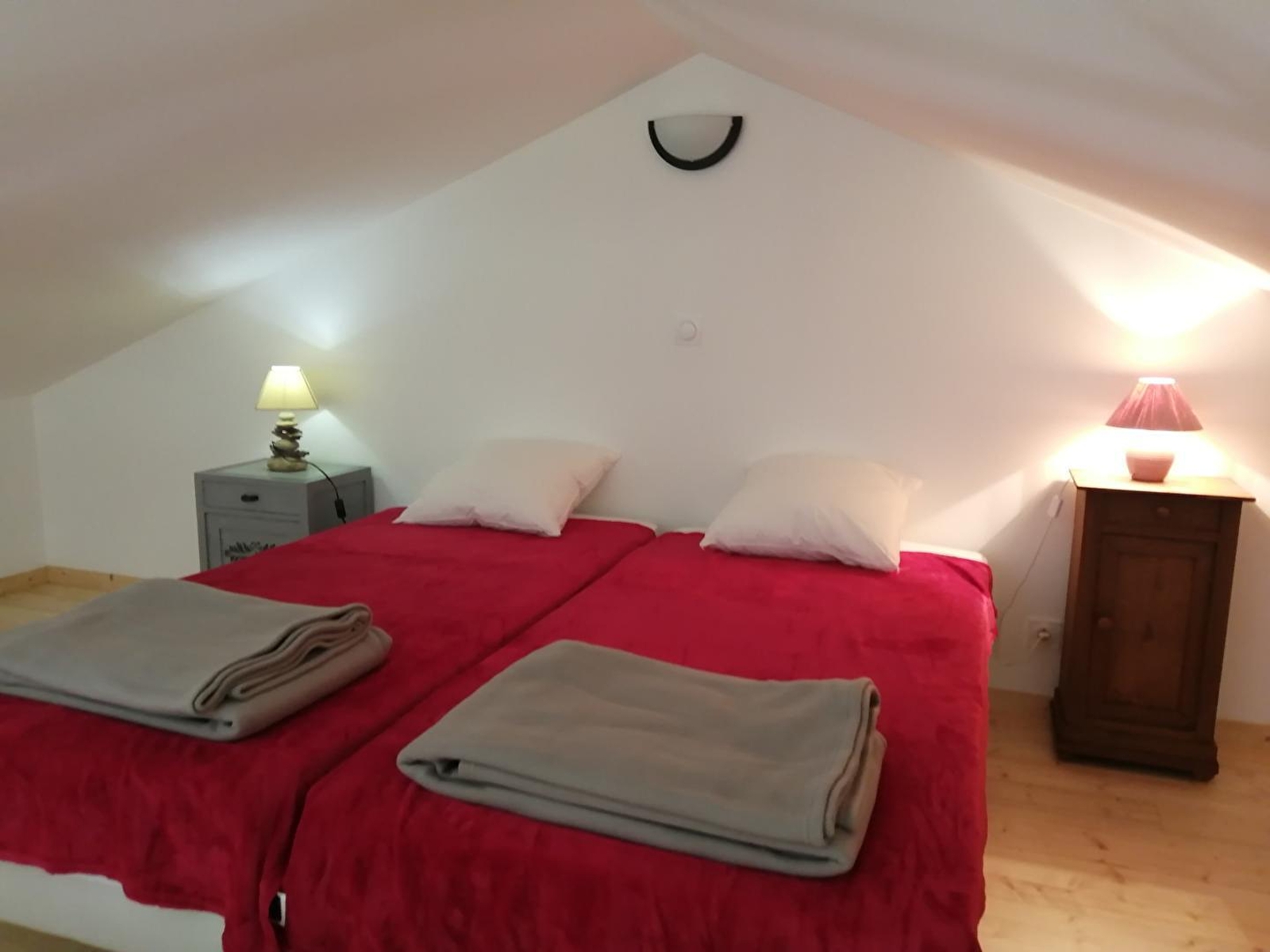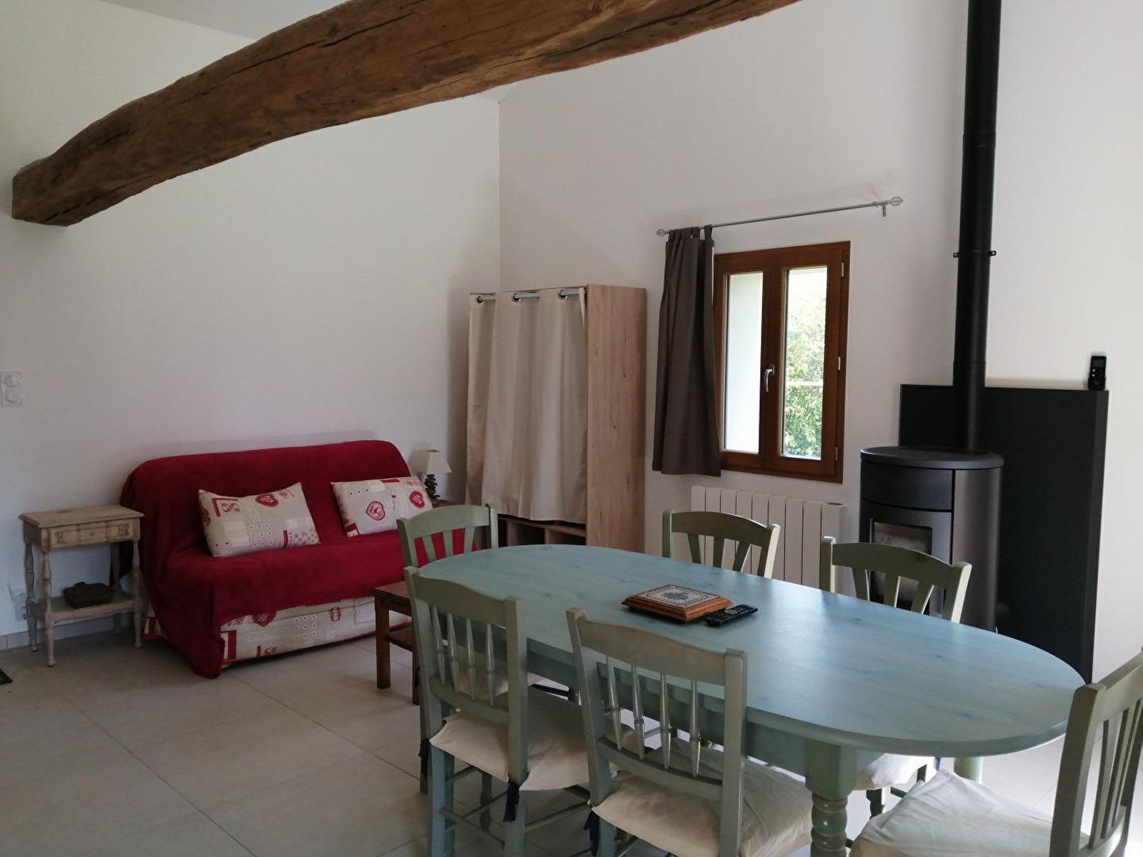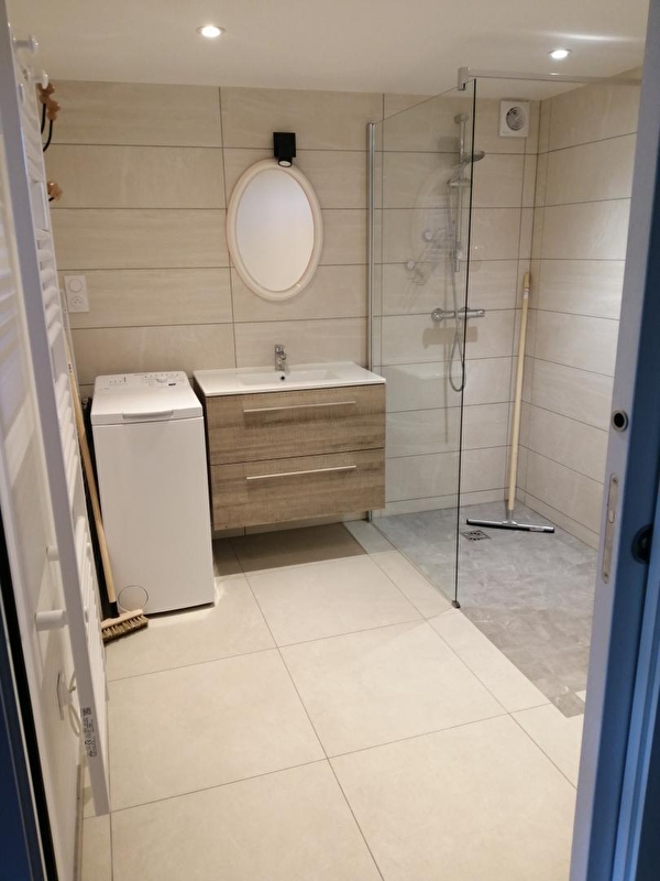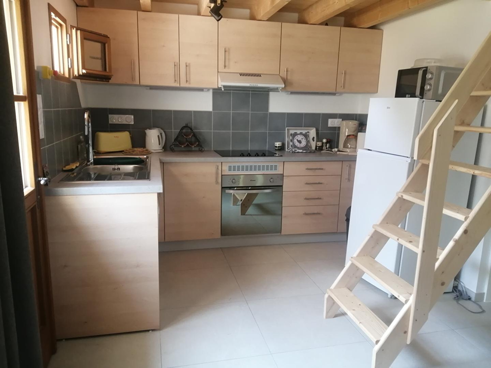 Großer Wohnraum mit offener Küche, Badezimmer mit begehbarer Dusche und Mezzanin aus Holz: 2 Betten von 90 cm Breite, Schlafsofa von 140 cm Breite (alles Qualitätsbettwäsche).