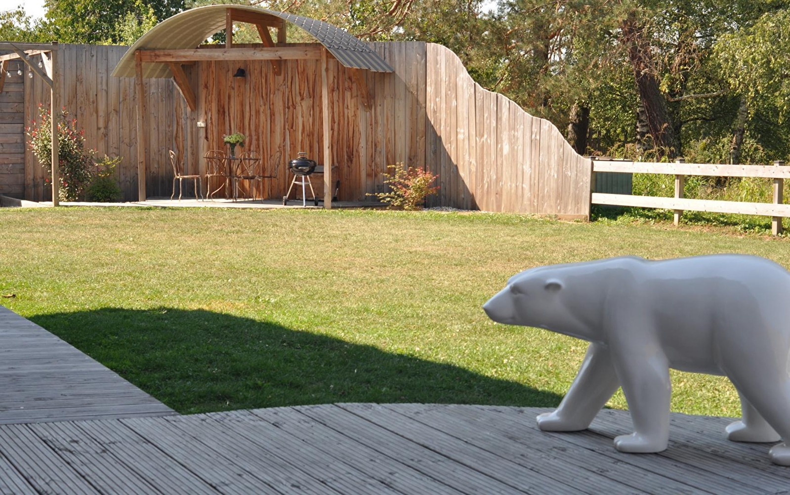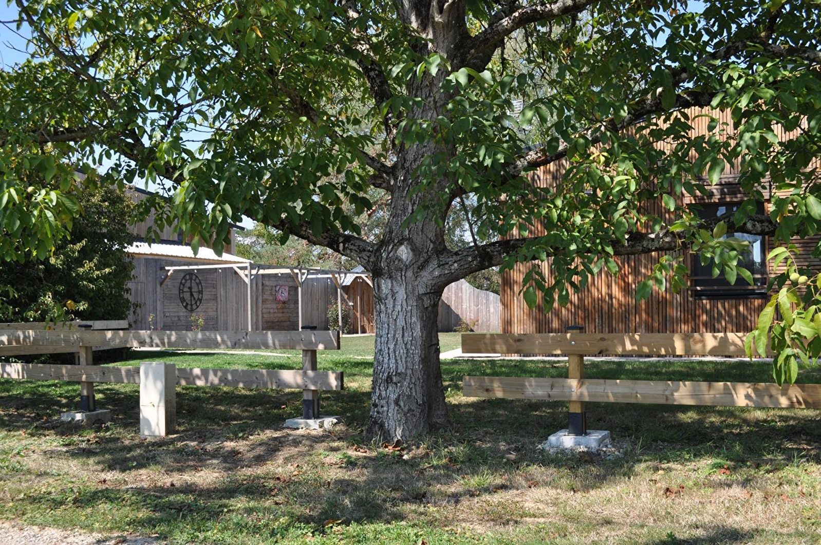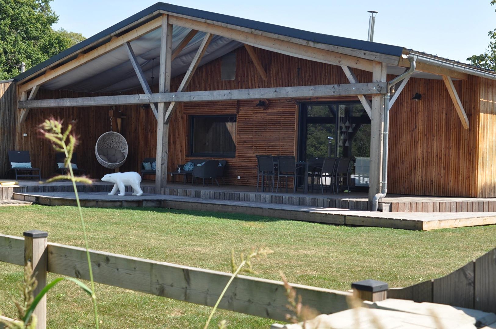 Dieses zeitgenössische, freistehende Holzhaus ist ebenerdig und wird Sie mit seiner Modernität, seinem Komfort und der Qualität seiner Leistungen begeistern. Der große und helle Wohnbereich besteht aus einer wunderschönen, voll ausgestatteten Küche und einem Wohnzimmer mit Flachbildfernseher und Pellet-Einsatz, um Ihre Winterabende noch gemütlicher zu gestalten. Ein erstes Badezimmer mit Dusche und WC grenzt an zwei Schlafzimmer: eines mit einem Bett von 160x200 und das andere mit zwei Betten von 90x200. Sie finden außerdem ein drittes Schlafzimmer mit einem Bett von 160x200cm, das über ein eigenes Badezimmer mit Dusche und WC verfügt. Alle drei Zimmer verfügen über einen eigenen Fernseher. Für Ihren Komfort sind die Betten bei Ihrer Ankunft bezogen, die Handtücher werden gestellt und die Reinigung ist im Preis inbegriffen.