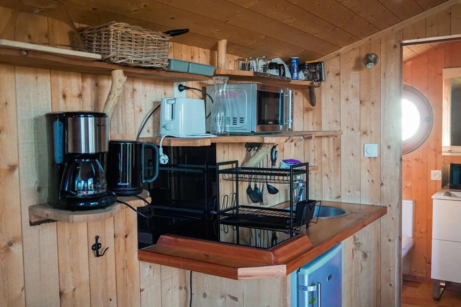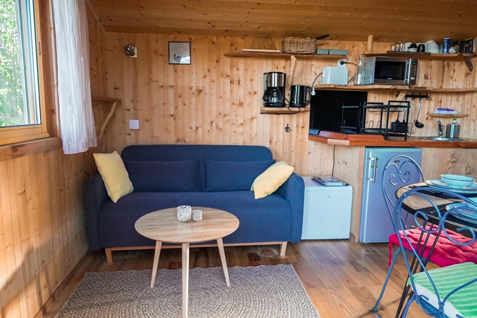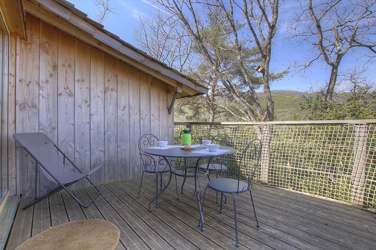 Die abgerundete Terrasse ist ein echter Wohnraum mit Essbereich und Liegestühlen. Sie ist der Abendsonne ausgesetzt und im Sommer vom Mittag bis zum Abend. Eine große Fensterfront teilt die Außenseite des Hauptwohnraums, der aus einem Essbereich mit roter Sitzbank und einer Küchenzeile (2 Cerankochfelder, Mikrowelle und Kühlschrank) besteht. Diese Hütte bietet den Luxus eines privaten Schlafzimmers mit einem 150 cm breiten Holzbett für 2 Personen. Der Zugang zum Badezimmer und zum WC erfolgt über den Hauptwohnraum. Es besteht die Möglichkeit, eine zusätzliche Schlafgelegenheit im Wohnraum zu schaffen. Bei Ihrer Ankunft wird Ihnen ein Kit mit den "Grundprodukten" ausgehändigt. Auf Wunsch wird Ihnen morgens ein "Frühstückskorb" gebracht. Unsere Favoriten: die Terrasse, ihre Aussicht natürlich und ihre Helligkeit, da jedes Zimmer über ein Fenster verfügt. La Pinède ist Teil eines Naturparks mit insgesamt 7 Hütten und Lodges, die vollständig in den Buchsbaumwald integriert sind, der sich auf den Höhen von Serrières sur Ain oberhalb des Flusses Ain befindet. Jede Hütte hat ihre eigene Identität und ist auf Stelzen in 2 m Höhe über dem Boden errichtet, die Zugänge und Terrassen sind vollständig gesichert. Außergewöhnlicher Ort in den Schluchten des Ain, der die Ausübung von Kanu- und Rudersport oder einfach nur das Baden ermöglicht. Hoch oben auf den Klippen können Sie mit GR und PR wandern. Mit etwas Glück, Geduld und frühem Aufstehen können Sie vielleicht Gämsen beobachten, die manchmal zum Weiden auf die Trockenrasen kommen. -10% auf Aufenthalte von 4 Nächten von Montag bis Donnerstag (außer vom 01/07 bis 31/08/2019).