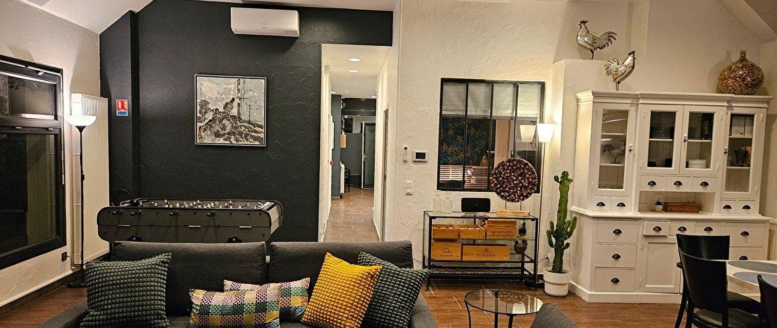 An der Grenze zwischen den Departements Jura und Saône et Loire befindet sich diese Unterkunft in einer alten Scheune aus dem Jahr 1850. Sie wurde von den Eigentümern vollständig renoviert, um Ihnen allen modernen Komfort zu bieten, und besteht im Erdgeschoss aus 2 Doppelzimmern (Bett 140*200) mit angeschlossenem Fernseher, einem Badezimmer mit Dusche, einem separaten WC, einer offenen, voll ausgestatteten Küche und einem Wohnraum von über 50 m2 mit einer Sitzecke, die mit 2 Schlafsofas (Möglichkeit, 4 Personen auf Anfrage und gegen Aufpreis aufzunehmen) und angeschlossenem Fernseher eingerichtet ist, und einer Essecke. Für entspannende Momente stehen ein Tischfußball, eine Bibliothek, Gesellschafts- und Outdoorspiele zur Verfügung Der Wohnbereich ist zur Rückseite des Gebäudes hin völlig offen, ohne gegenüber mit direktem Zugang zu einer schattigen Terrasse von 45 m2 Das Obergeschoss besteht aus 2 Schlafzimmern mit jeweils 1 Doppelbett (140*190) mit eigenem Bad, offenem oder halboffenem Raum (1 Badewanne oder 1 Dusche), Fernseher mit Internetanschluss. Für Ihren Komfort sind die Betten bei Ihrer Ankunft bezogen, die Handtücher werden gestellt und die Reinigung ist im Preis inbegriffen. Der Parkplatz ist privat und ermöglicht langes Parken. Wir akzeptieren Wohnmobile und verfügen auch über einen gesicherten Bereich für Fahrräder und Motorräder. Die Unterkunft befindet sich auf halbem Weg nach Lons le Saunier (Museum, Freizeitpark, Thermalbad, Spielcasino) und Louhans, das einen der schönsten Märkte Frankreichs besitzt. Wir sind 5 Minuten von der Ausfahrt Nr. 8 der A39 entfernt, 1 Stunde von Beaune, Dijon und Besançon, 1 Stunde und 15 Minuten von Lyon und 1 Stunde und 30 Minuten von Genf. Die ersten Skipisten sind 45 Minuten und das Seengebiet 30 Minuten entfernt. Das Ferienhaus ist 200 m von der vollständig fußgängerfreundlichen "Voie Bressanne" entfernt, die Lons le Saunier mit Châlon sur Saône verbindet.