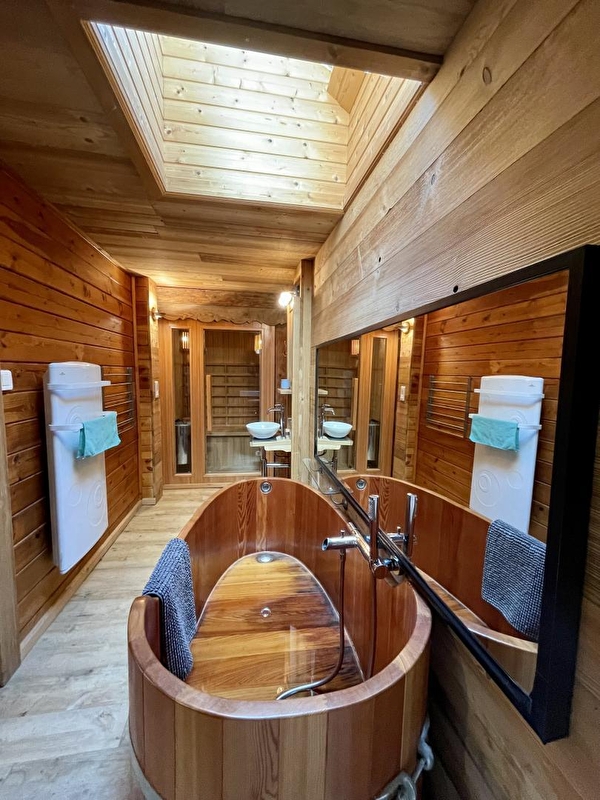 Unser Chalet Acqua erwartet Sie in einem 2 Hektar großen Park mit Bäumen, ebenso wie das zur Verfügung gestellte Familienschwimmbad (in der Sommersaison) und der Zugang zur Chalet-Sauna namens Braza und zum Nordischen Bad.