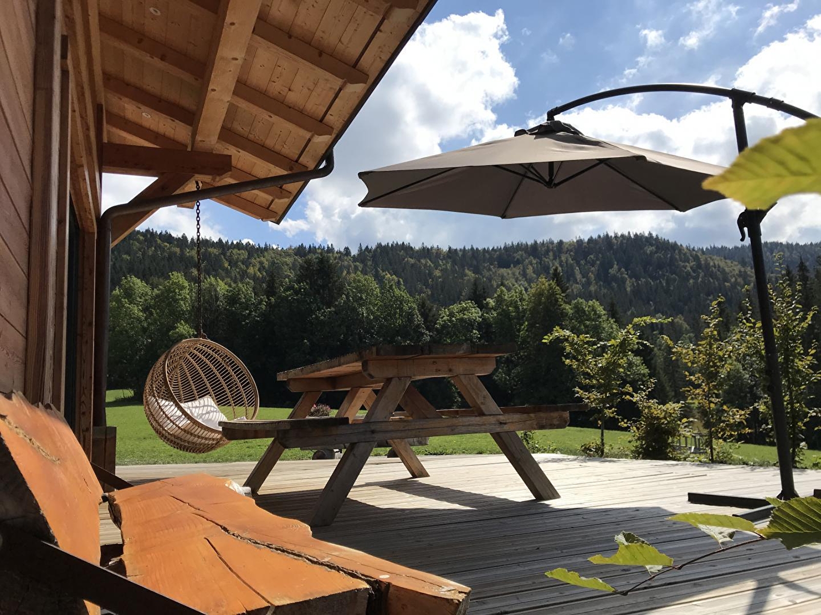 Genießen Sie an schönen Tagen die 60m² große Holzterrasse, die einen atemberaubenden Blick auf die umliegende Natur bietet.
