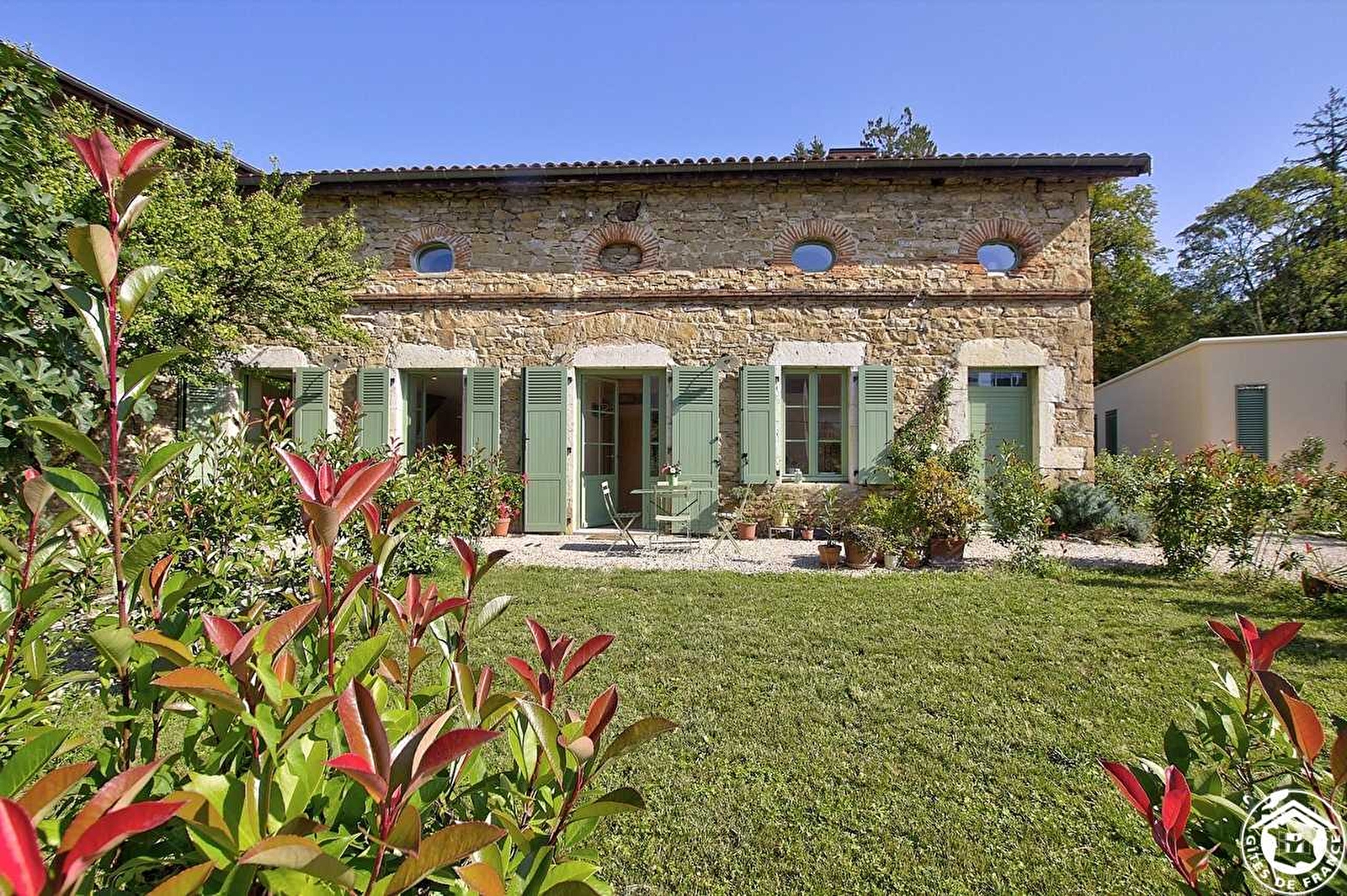 Durch ein großes Tor gelangen Sie auf ein großes, baumbestandenes Grundstück, auf dem sich einerseits das Haus der Eigentümer mit drei Gästezimmern und andererseits ihre Ferienhäuser Hauterive und Varey befinden, die aneinander grenzen, um ein einziges Ferienhaus anzubieten. Über einen separaten Eingang gelangen Sie in einen Wohnraum, in dem sich das Holzambiente harmonisch mit der sanften und schlichten Dekoration mit Vintage-Elementen vermischt. Vom Wohnzimmer aus gelangen Sie über eine Treppe in das Badezimmer, das separate WC und die beiden Schlafzimmer Ihrer Wahl: ein Zimmer in Rosatönen (ein Bett 190*200) mit Blick auf den Garten und den Park und das Zimmer mit zwei Einzelbetten (2*90*200), zwei Ochsenaugen und einem Dachfenster. Im Erdgeschoss gelangen Sie durch eine Verbindungstür in den Wohnraum der zweiten Gîte mit Vintage-Dekoration, wo sich die ausgestattete Küchenzeile mit Essbereich und das Wohnzimmer vermischen. Über eine schöne Holztreppe gelangen Sie in den ersten Stock, wo Sie ein Elternschlafzimmer mit einem 180*200 cm breiten Bett (trennbar in zwei 90*200 cm breite Betten) und ein Badezimmer mit kleinen grünen Mosaikfliesen und einem integrierten, aber separaten WC vorfinden. Das Plus dieses Ferienhauses: All-inclusive - Betten sind bei Ihrer Ankunft gemacht. Zwei private, nach Norden und Süden ausgerichtete Terrassen am Ferienhaus. In diesem großen Park mit Bäumen gibt es einen kleinen Strand am Ufer des Oiselon, einem kleinen Wasserlauf, der durch das Anwesen fließt, zu entdecken und die Ruhe der Umgebung zu genießen. Die Eigentümer stellen den Gästen zwei Swimmingpools zur Verfügung: einen Außenpool und einen Innenschwimmbereich, der sich im Haupthaus befindet, sowie einen Sportbereich (Kardio- und Krafttraining). Entdecken Sie die Seidenfabrik von Jujurieux oder das Festival von Ambronay mit seinen Barockkonzerten.