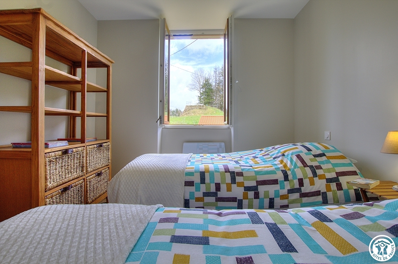 Der Eingang mit seinen 4 Stufen führt zu einem großen Wohnraum. Ein separates WC ist vorhanden. Auf der oberen Ebene befinden sich zwei Schlafzimmer mit jeweils zwei Einzelbetten 80*200, die zusammengestellt werden können oder nicht.
