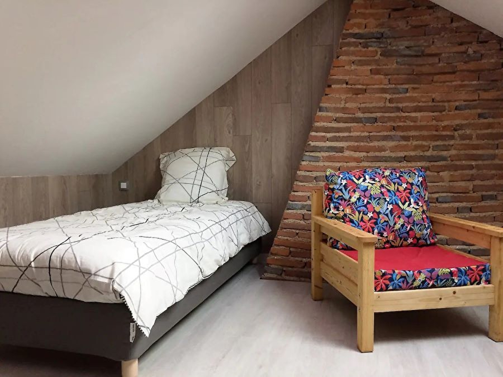 >> Das Zimmer "grand-duc" besteht aus zwei Räumen: im Erdgeschoss befindet sich ein Bett von 140x190, ein Badezimmer und ein separates WC, und im Obergeschoss (Zugang über eine ziemlich steile Treppe) 2 Betten von 90x190.