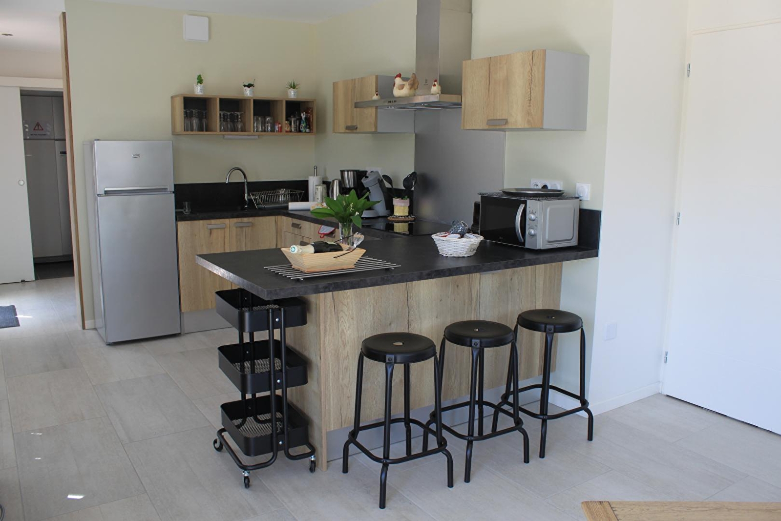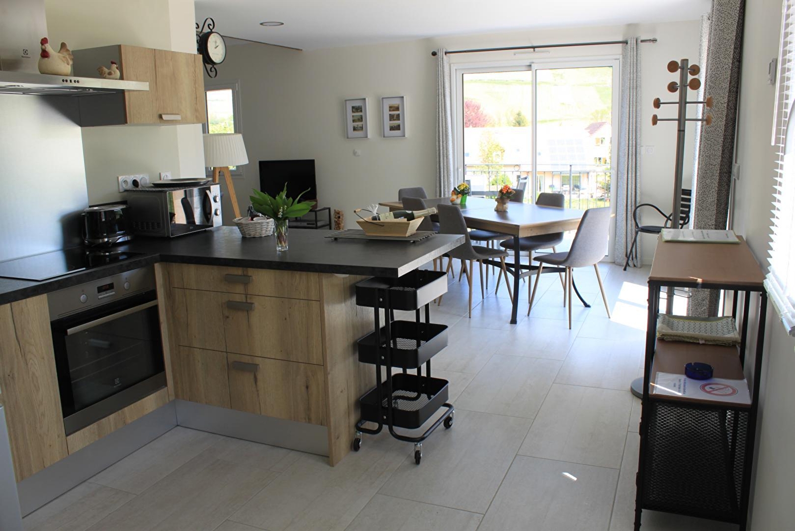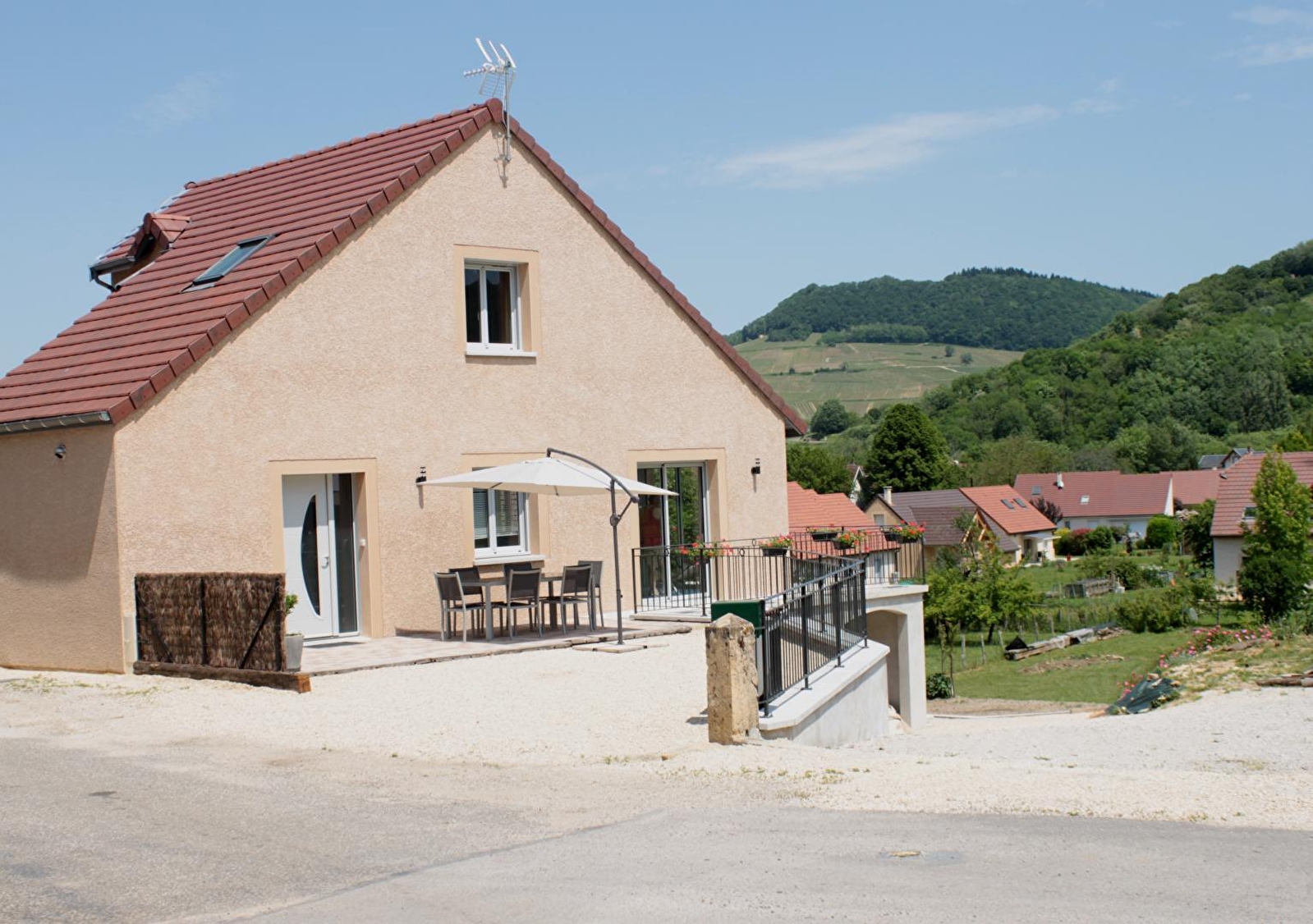 Entdecken Sie dieses Ferienhaus, das einen Panoramablick auf Château-Chalon (klassifiziert als eines der schönsten Dörfer Frankreichs) und seine Weinberge bietet. Dieses helle, 100 m2 große, komplett neue und behindertengerechte Ferienhaus kann bis zu 6 Personen beherbergen. Im Erdgeschoss befindet sich ein großer Wohnraum von 45 m2 mit ausgestatteter Küche, Esszimmer mit Zugang zu Terrasse und Balkon, Wohnzimmer, Badezimmer mit italienischer Dusche und WC, ein Schlafzimmer von 12 m2 mit einem Bett von 140 cm. Im Obergeschoss befindet sich ein 15 m2 großes Zimmer mit zwei Einzelbetten, die auf Anfrage in ein 180 cm breites Bett umgewandelt werden können (Babybett auf Anfrage), ein 10 m2 großes Zimmer mit einem 140 cm breiten Bett, ein Badezimmer mit Dusche und Waschbecken sowie ein separates WC.