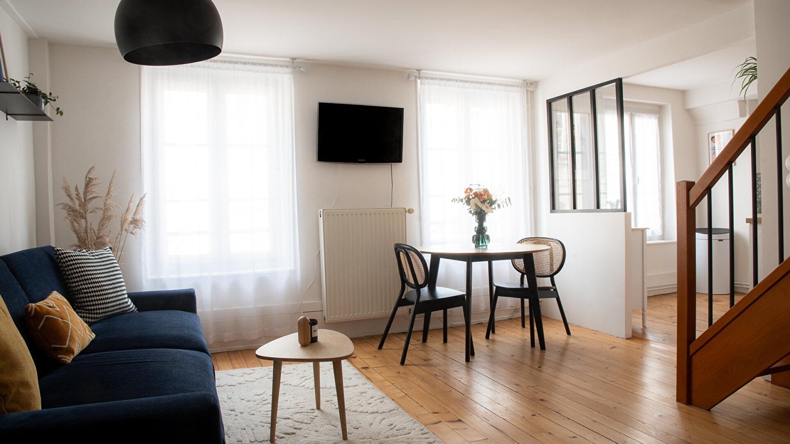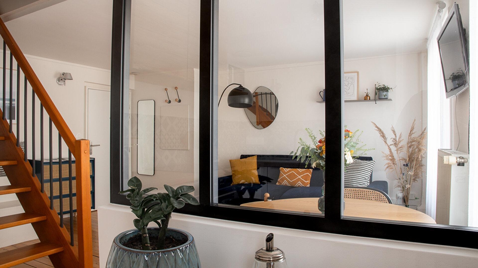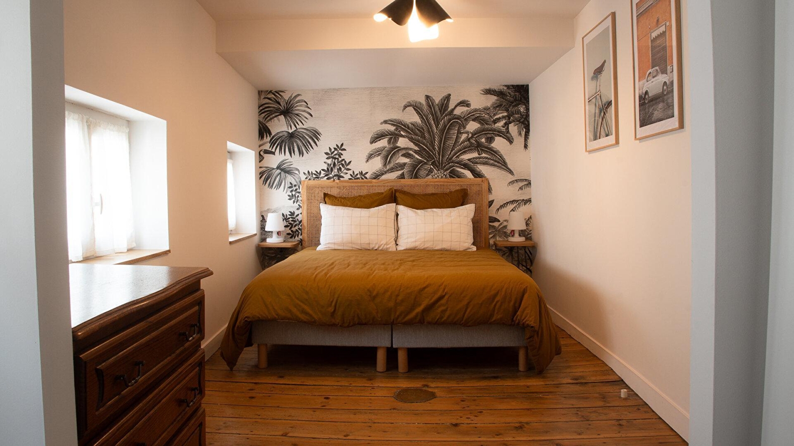 Sie besteht aus einem Wohnraum mit voll ausgestatteter Küche und einem Wohnzimmer mit Sofa und Fernseher. Im Obergeschoss befinden sich das Badezimmer mit WC und das Schlafzimmer mit einem Doppelbett (160x200). Für Ihren Komfort wird das Bett bei Ihrer Ankunft gemacht und die Handtücher werden bereitgestellt.