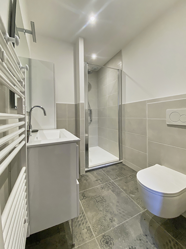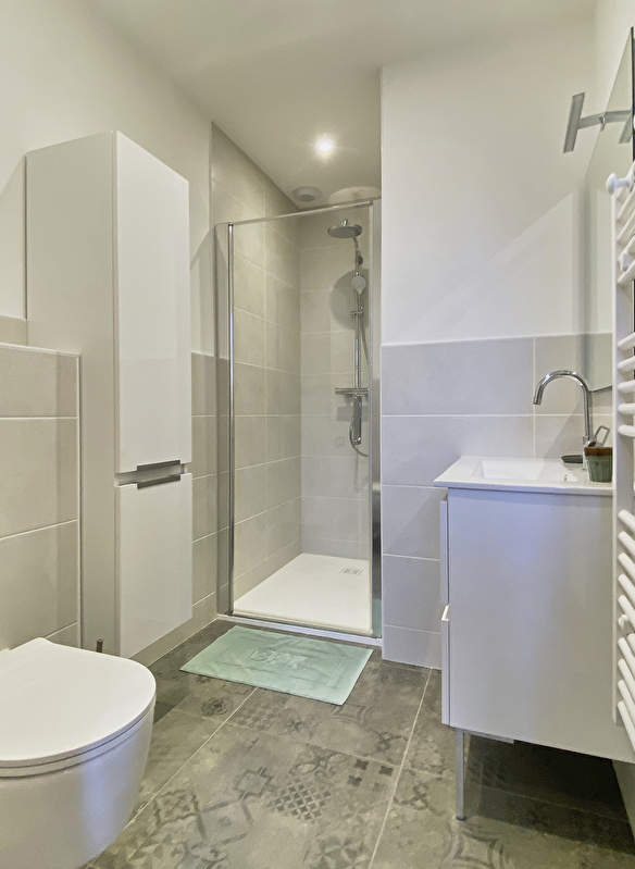 Badezimmer mit Aufbewahrungsmöbeln, Dusche und Hängetoilette.