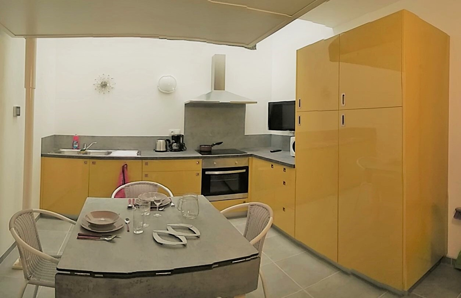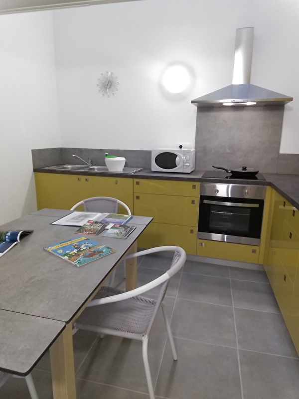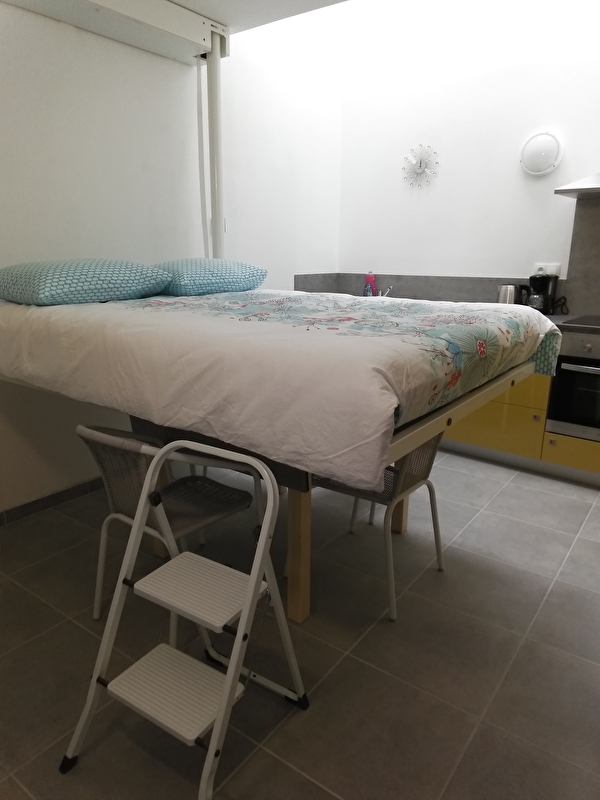 Das Studio besteht aus einem 13m² großen Raum mit einer ausgestatteten Küche und einem Klappbett (140x190), das von der Decke herabgelassen wird und sich 1 Meter über dem Boden befindet, wenn es heruntergelassen wird, sowie einem Badezimmer (Dusche, Waschbecken, WC). Es wird durch zwei Oberlichter erhellt.