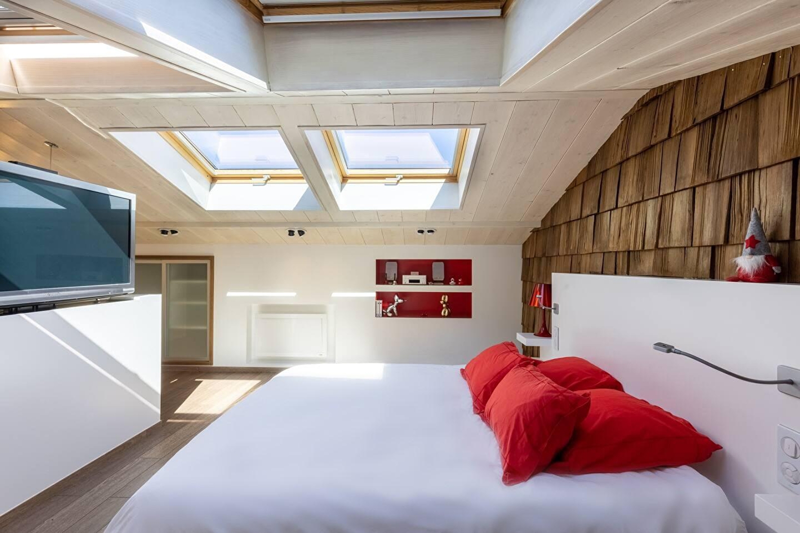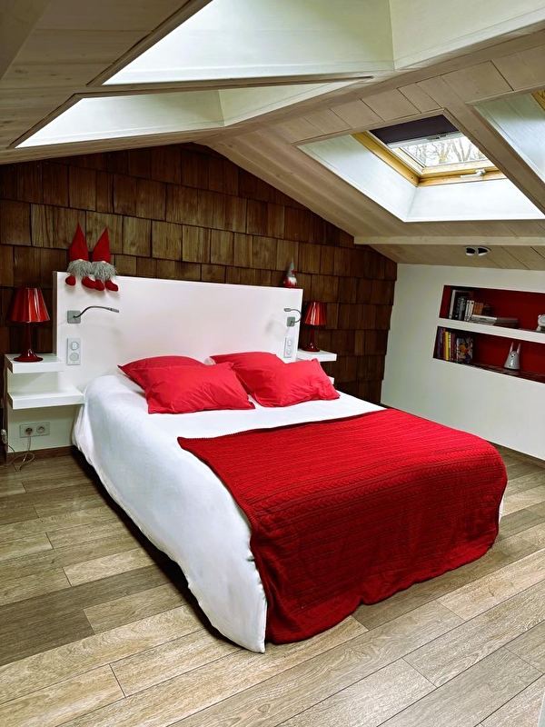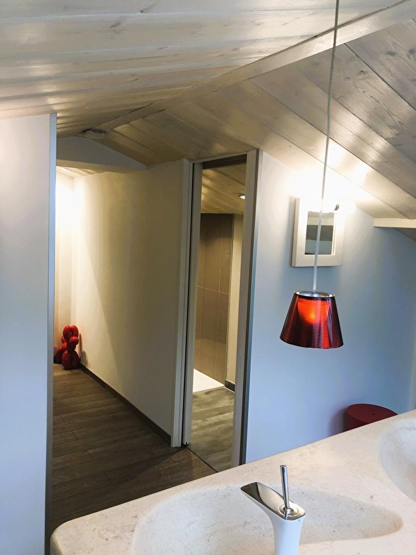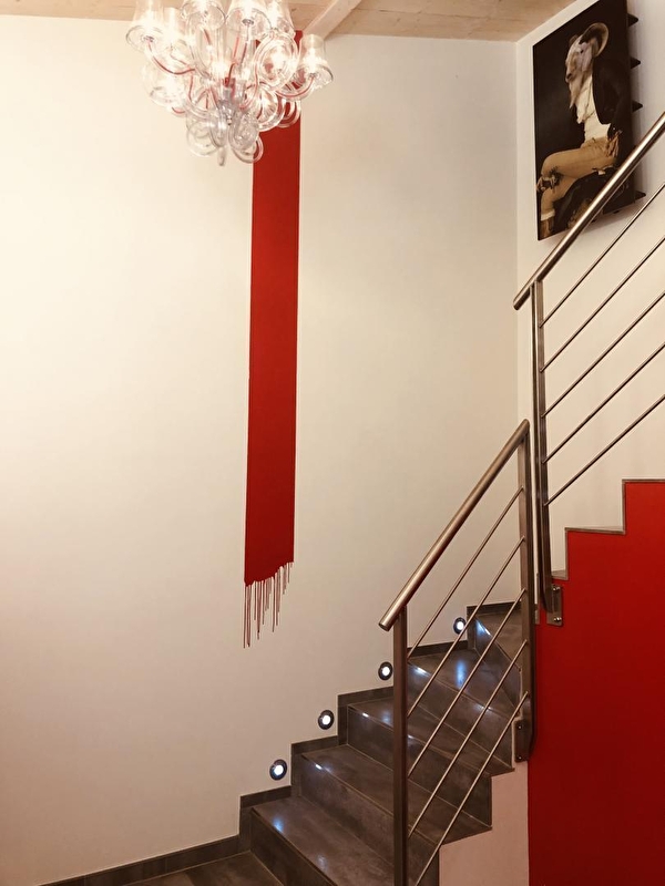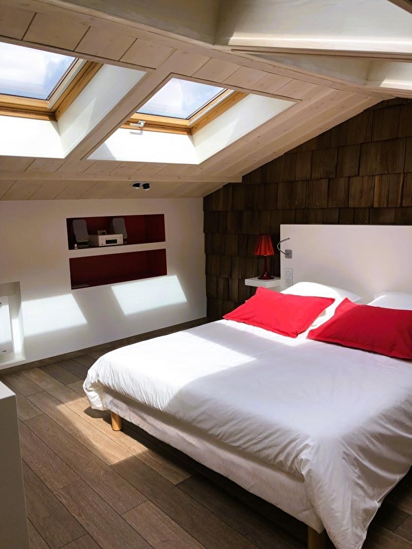 Öffnen Sie die Tür von Vanadium und entdecken Sie zunächst im Erdgeschoss die Küche, die mit Induktionskochfeldern und einer Siemens-Mikrowelle ausgestattet ist. Das Rot schafft sofort einen starken Kontrast und gibt den Ton an. Dieser Ort wird Ihnen sofort ins Auge fallen und seine Originalität wird Ihnen nicht entgehen. In den Nischen stehen Nespresso-Kaffeemaschine, Alessi-Wasserkocher, Denon-Lautsprecher und andere kleine Designobjekte, die oft in Rot gekleidet sind. So wie der Smeg-Kühlschrank, der Ihre Abende erfrischen wird. Von der Küche aus gelangen Sie auf die Terrasse, wo Sie einen Moment der Ruhe genießen können, während die Vögel singen (und ein wenig wiehern). Im Obergeschoss des Ferienhauses erwartet Sie ein hochwertiges Bett (160x200 cm) im Schlafzimmer, das dank der schönen Öffnungen im Dach von natürlichem Licht durchflutet wird. Im Winter wärmen Sie eine "Everet"-Bettdecke und Bettwäsche von Carré Blanc. Das Schlafzimmer ist mit allem Komfort ausgestattet: Doppelwaschbecken am Ende des Bettes, große begehbare Dusche. Klicken Sie auf einen Knopf und ein Fernseher erscheint wie von Zauberhand: ein 55-Zoll-HD-Bildschirm mit Zugang zu Apple TV, Netflix und Canal+. Vanadium ist mit Fat Boy-Leuchten und Designobjekten dekoriert.