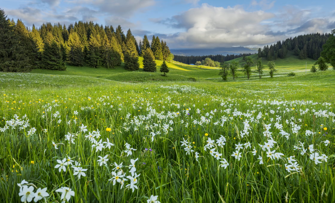Der Frühling im Juragebirge ist eine traumhafte Jahreszeit, um in die Natur einzutauchen. Die Natur erwacht und bietet dir das allerschönste Schauspiel. Die Wiesen in der Ebene und in den Bergen erblühen mit wilden Narzissen, Krokussen oder Feldblumen, und das Bild ist überwältigend.