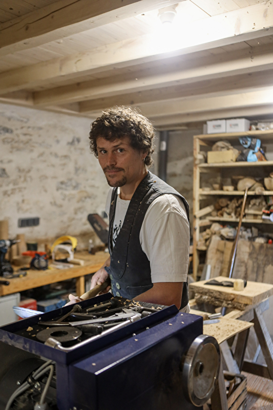 Die Arbeit ist vollständig handwerklich und wird auf meiner Holzdrehmaschine von Hand gefertigt. Die Stücke, Einzelstücke oder kleine Serien, sind das Ergebnis der Begegnung von Holz, meinem Auge und stundenlanger Erfahrung.