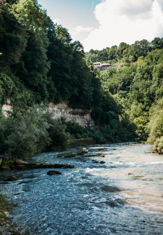 Le jour suivant nous arrivons dans la ville de Bellegarde. L’intérêt de cette étape de la GTJ est surtout de descendre dans les antres de la ville pour découvrir les Pertes de la Valserine. Ce canyon grandeur nature dessiné par les eaux de la Valserine est une pause fraîcheur bien appréciée. C’est donc dans ce cadre luxuriant et apaisant, que l’on suit ces eaux tumultueuses sur un sentier aménagé qui passe de berges en cavités naturelles.