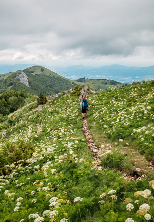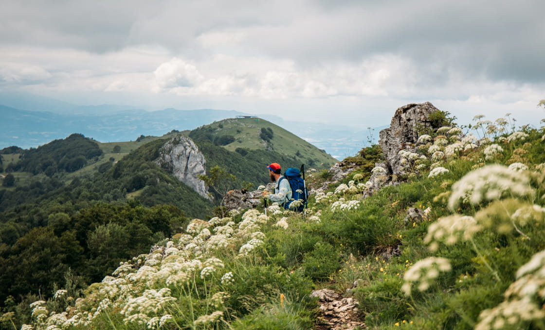 Découvrir les Pertes de la ValserineRandonner jusqu’au mythique Grand Colombier marque la dernière étape de la GTJ. Ce sommet de l’Ain aux portes de Culoz est bien connu des cyclistes et offre une superbe vue sur le lac du Bourget et la chaîne des Alpes. Le contraste des fleurs printanières, prairies et des nuages cendres était fascinant, même si je vous souhaite d’avoir une météo optimale et dégagée. Avec un peu de chance vous pourriez même voir le célèbre Mont-Blanc.