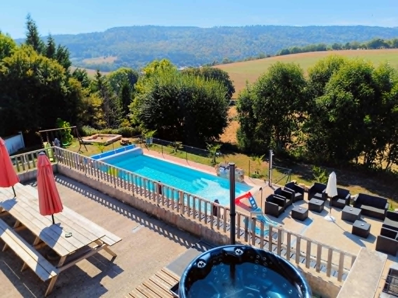 2 große Terrassen mit Tisch und Bänken, 1 Sauna, 1 SPA PRO 7 Personen, 1 beheizter Außenpool im Sommer und Winter, Tischfußball, Tischtennisraum, Volleyballfeld, Kinderbereiche (Sandkasten, Rutsche, Schaukeln, Mini-Fußballkäfig, Bouleplatz, Seilbahn), Grünfläche, Ski- und Mountainbike-Raum, angrenzender Privatparkplatz, nicht asphaltiert.