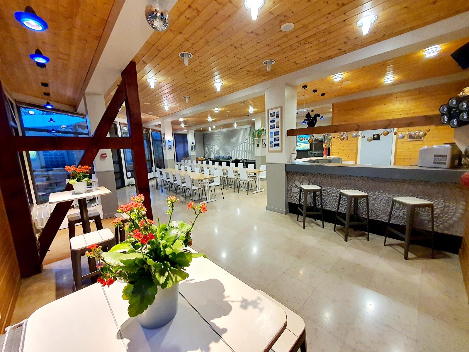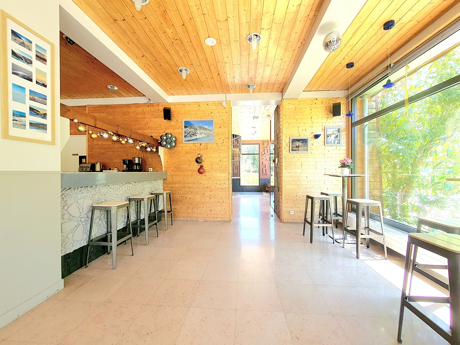 Der große Empfangsraum im Erdgeschoss ist der perfekte Ort für Gäste, die sich zu den Mahlzeiten treffen, sich am Billardtisch oder Tischfußball vergnügen oder einen Drink an der Bar oder im Wohnzimmer vor dem Kamin genießen möchten. Die voll ausgestattete Profiküche, die den Gruppen zur Verfügung steht, bietet zahlreiche Möglichkeiten, um unvergessliche Essensmomente vorzubereiten, die sich auf der großen Terrasse mit ihrem vom Frühjahr bis zum Herbst aufgestellten Barnum fortsetzen, wo während der schönen Jahreszeit BBQs und Aperitifs aneinandergereiht werden.