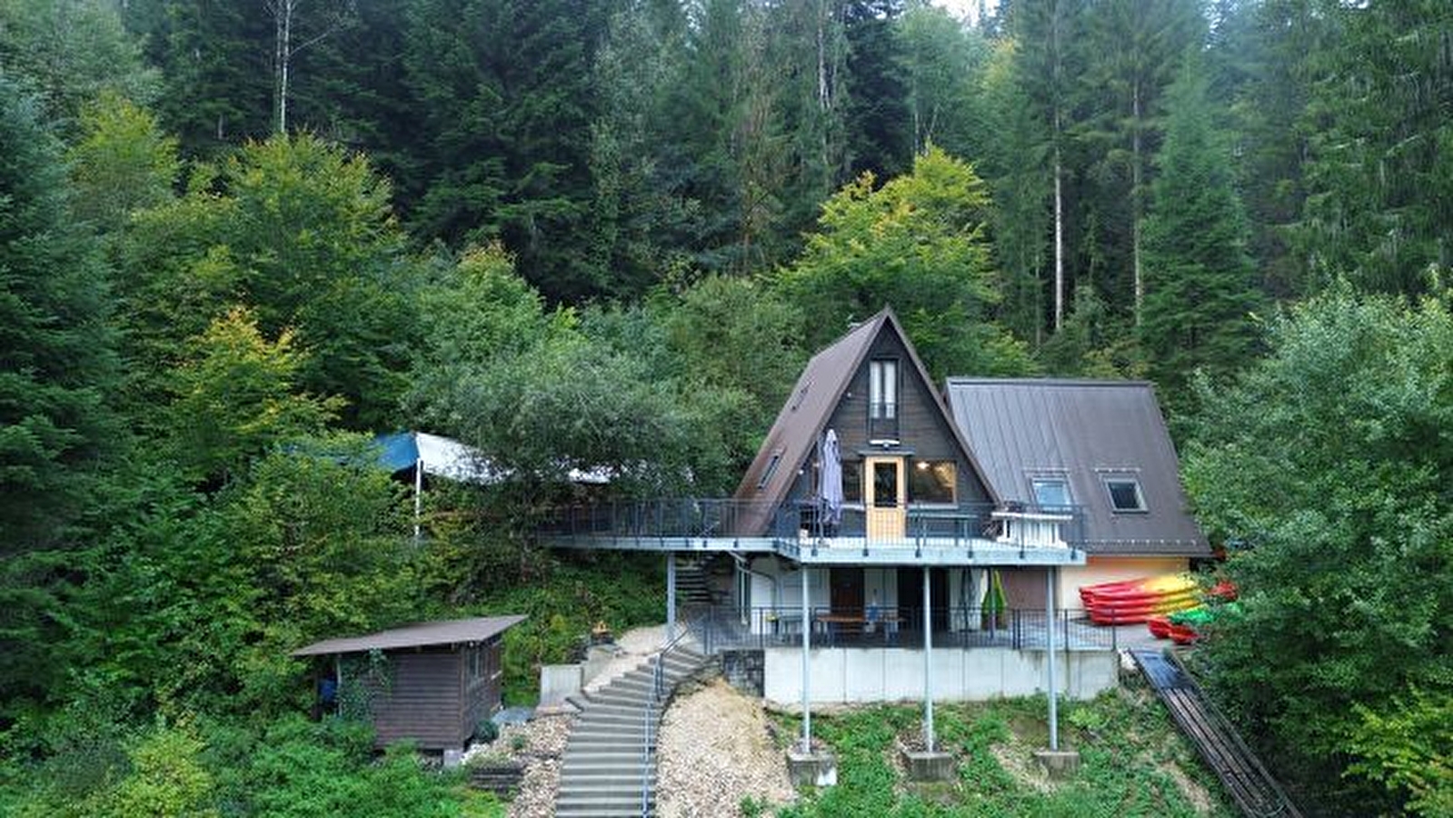 Kleine Chalets inmitten der Natur am Ufer des Doubs in der Nähe des typisch französisch-schweizerischen Dorfes Goumois. Dieses Zentrum befindet sich auf dem Gelände des Kanu-Kajaks, wo du diese Aktivität entdecken kannst.