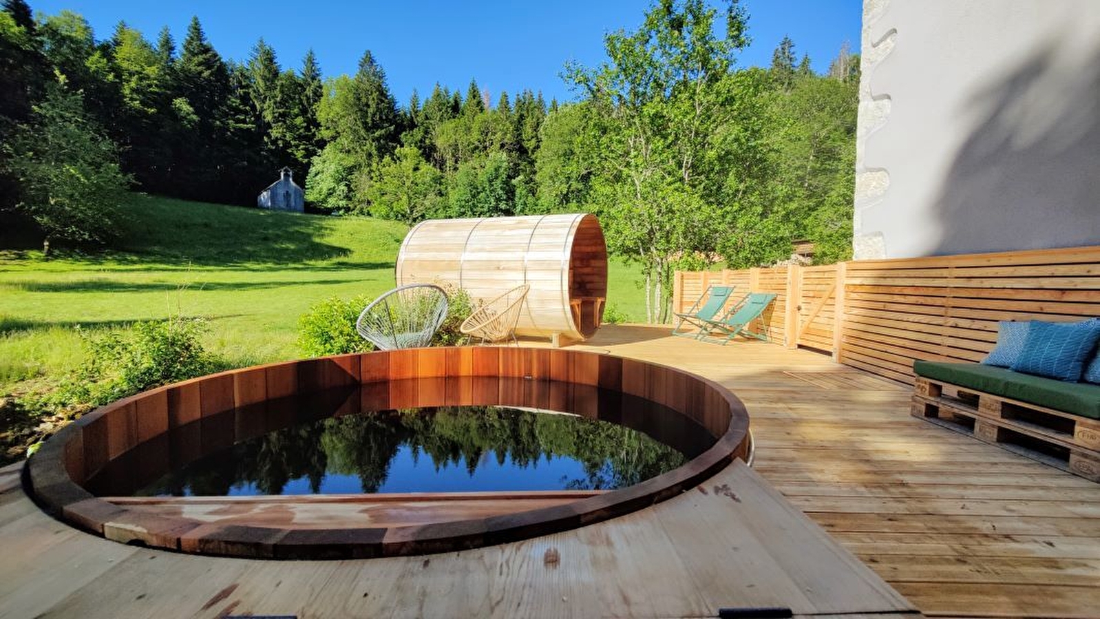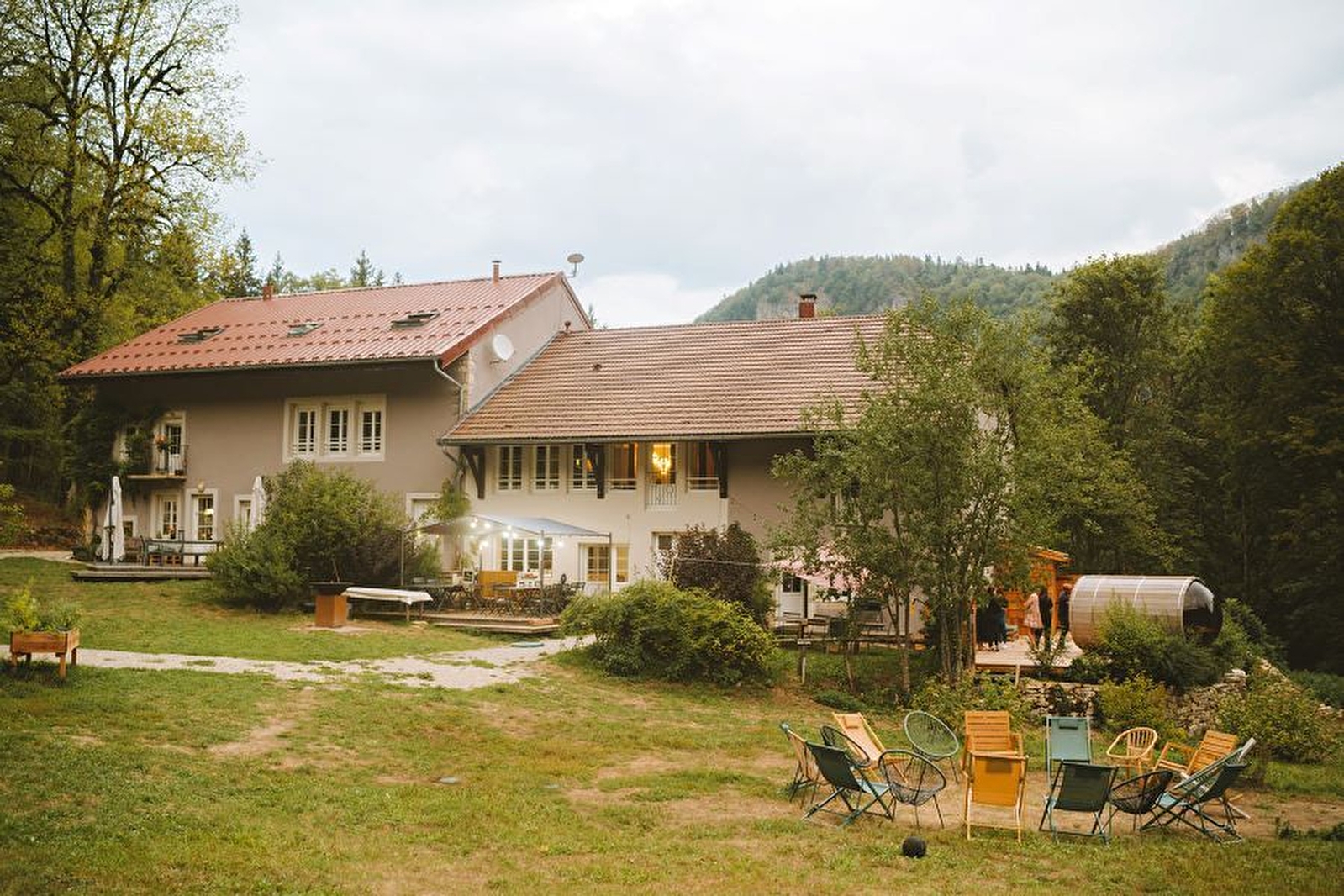Im Herzen der Juraberge empfängt Sie die Domaine le Coupet mit der Familie, mit Freunden oder für eine geschäftliche Veranstaltung für bis zu 25 Personen. Während Ihres Aufenthalts verfügen Sie über eine riesige Unterkunft mit hohem Komfort, ein Outdoor-Spa (Panoramasauna und nordisches Bad), das zu jeder Jahreszeit geöffnet ist, Highspeed-Wifi und erstaunliche Außenanlagen, die Groß und Klein begeistern werden. 8 Zimmer, davon 7 mit Sanitäranlagen (3 Doppelbetten 160 cm, 22 Einzelbetten 90 cm). Ein großer Wohnraum mit offener Küche, Wohnzimmern und Spielzimmern, damit Sie die Umgebung voll und ganz genießen können. Sie haben die Wahl zwischen Selbstversorgung und Verpflegung und können für Ihre Gruppe Event-Mahlzeiten sowie sportliche und kreative Aktivitäten in der Natur organisieren. Le Coupet liegt nur 1,5 Stunden von Lyon, Genf und Lausanne entfernt und ist ein Ort "into the Wild", an dem ökologische Verantwortung mit Feiern, Freude und Wohlbefinden einhergeht.