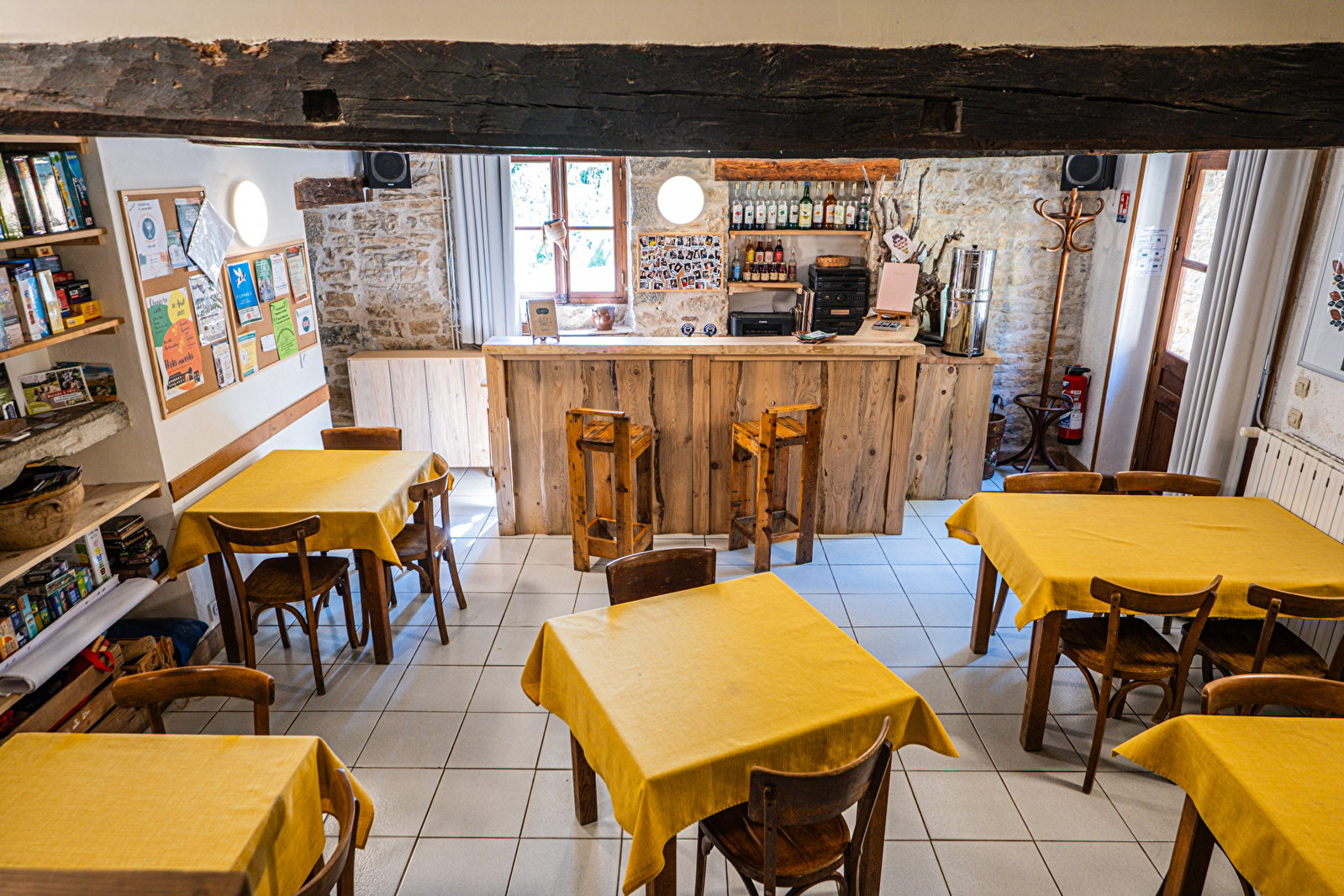 Der 70 m2 große Herbergssaal mit offenem Kamin, Holzbalken und Steinmauern bietet Platz für bis zu 40 Gäste. Hier finden Sie auch eine Ludothek mit über 500 Gesellschaftsspielen.