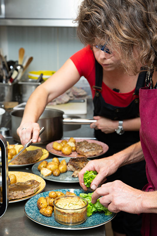 Das gesamte Fleisch (Rind, Kalb und Schwein) stammt von Tieren, die auf unseren Wiesen im Freien aufgezogen werden. Gemüse, Mehl und Käse werden ebenfalls auf unserem Hof produziert.