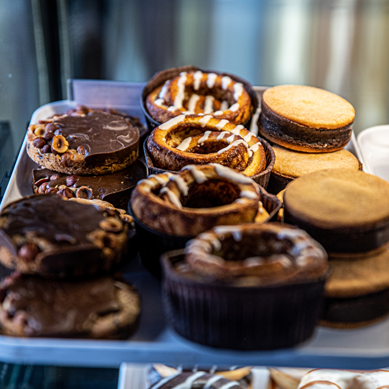 Als Beilage gibt es eine Auswahl an Feingebäck (Donuts, Muffins) sowie eine Reihe von schnellen salzigen Snacks, die auf die Mittagspause abgestimmt sind (Ciabattas, Croque Monsieur).