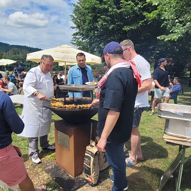 Die traditionelle Küche bietet verschiedene Gerichte, bei denen die Produkte der Region im Vordergrund stehen und die Sie in einem geräumigen und malerischen Saal oder auf der Terrasse genießen können, um einen angenehmen Blick auf den Fluss Oignin zu haben.