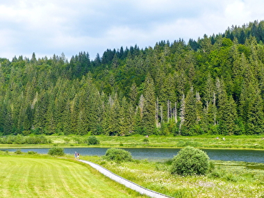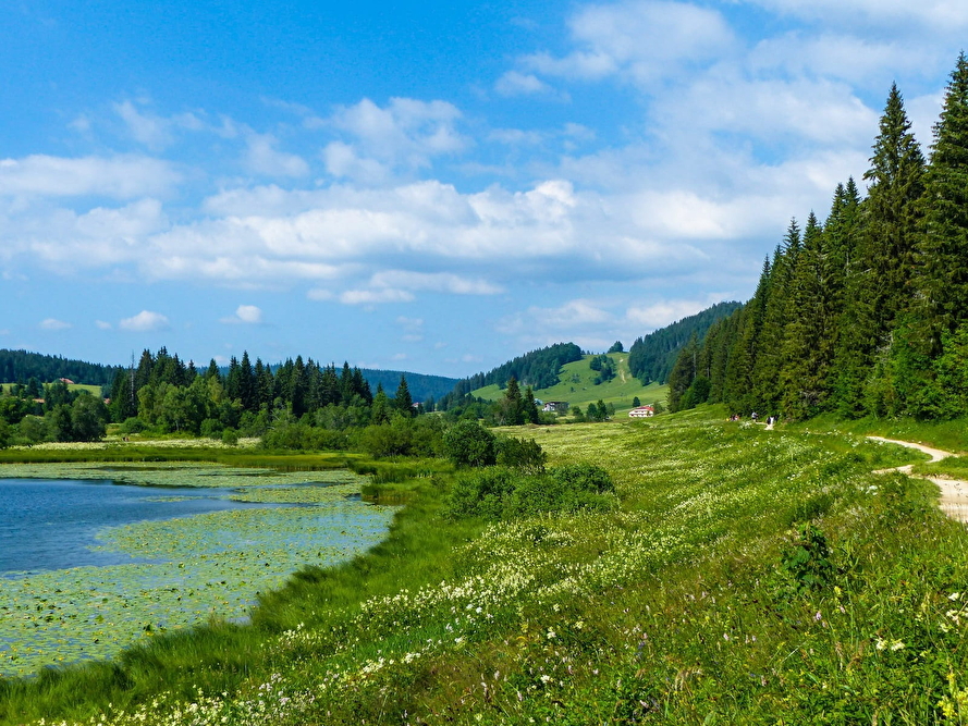Lege dein Handtuch auf den angelegten (und überwachten) Strand und genieße eine außergewöhnliche Aussicht, die du am Meer nie finden wirst. Schluss mit Wasser, so weit das Auge reicht, ohne Farben oder Konturen! Hier hat rechts ein Torfmoor seinen Platz, links ein Tannenwald, wie er für den Jura typisch ist... Und weiter hinten, am Horizont, Wiesen voller wilder Orchideen.
