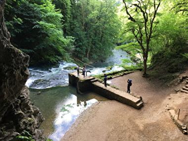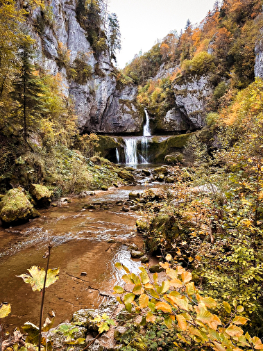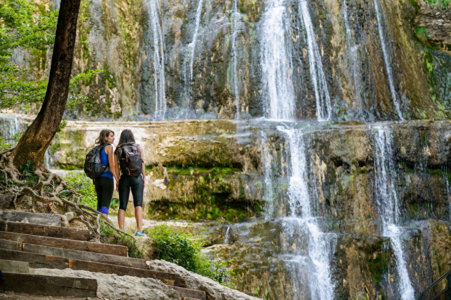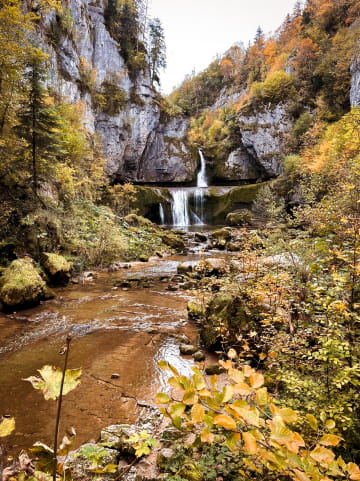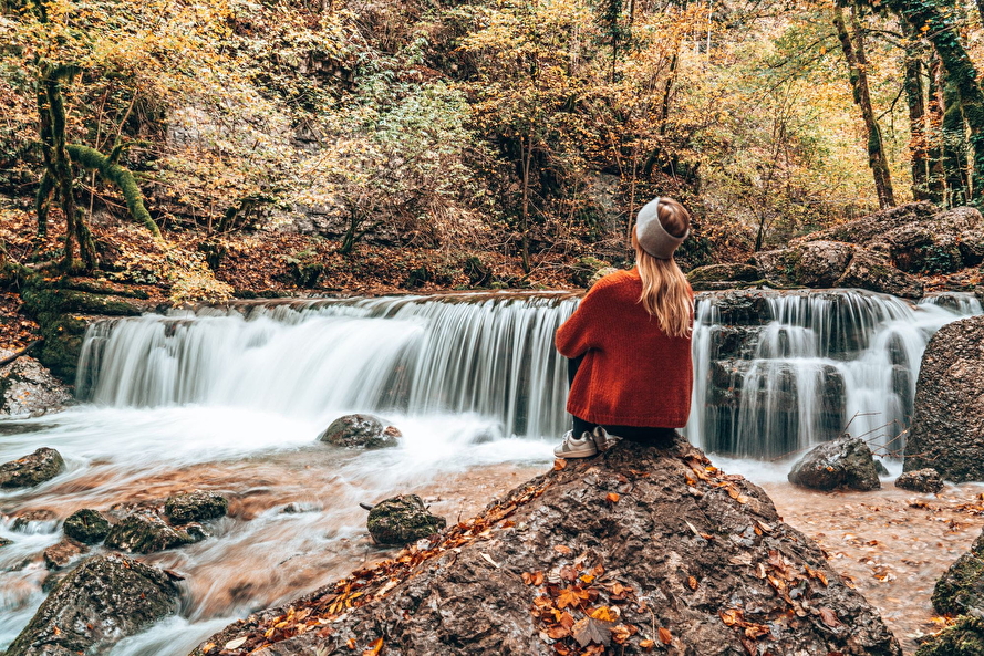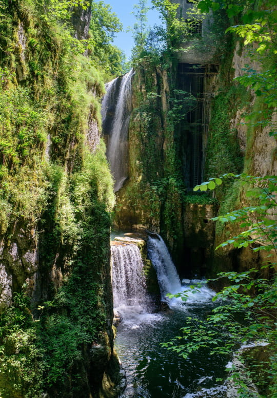 Nimm die Via Rhôna und gehe auf einen halbstündigen Spaziergang oder eine Spazierfahrt mit dem Fahrrad durch den wilden Wald des Juragebirges, bevor du diesen herrlichen Wasserfall entdeckst.
