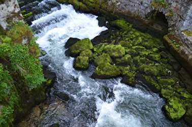 Der Fluss stürzt sich aus einer imposanten Masse von Felsen, die ein riesiges Gewölbe bilden, unter dem er tost. Er springt in Kaskaden von Fels zu Fels, er ist ein Wasserfall, der von tausend Unebenheiten zerschmettert wird. Das Besondere an diesem Schauspiel ist, dass es alle Sinne durch ein ich-weiß-nicht-welches Übermaß an Emotionen peinigt.