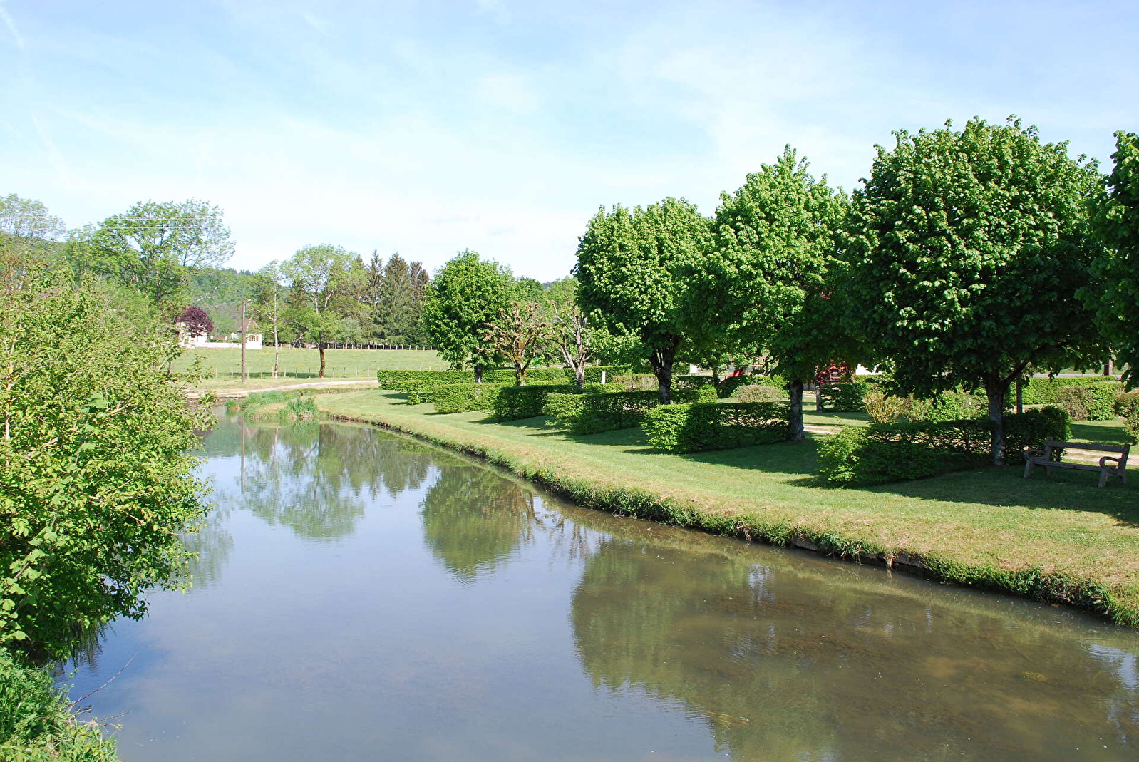 Wohnmobilstellplatz in einer grünen Umgebung am Flussufer gelegen, ausgestattet mit Wasser- und Stromanschluss sowie einer Entsorgungsstation.