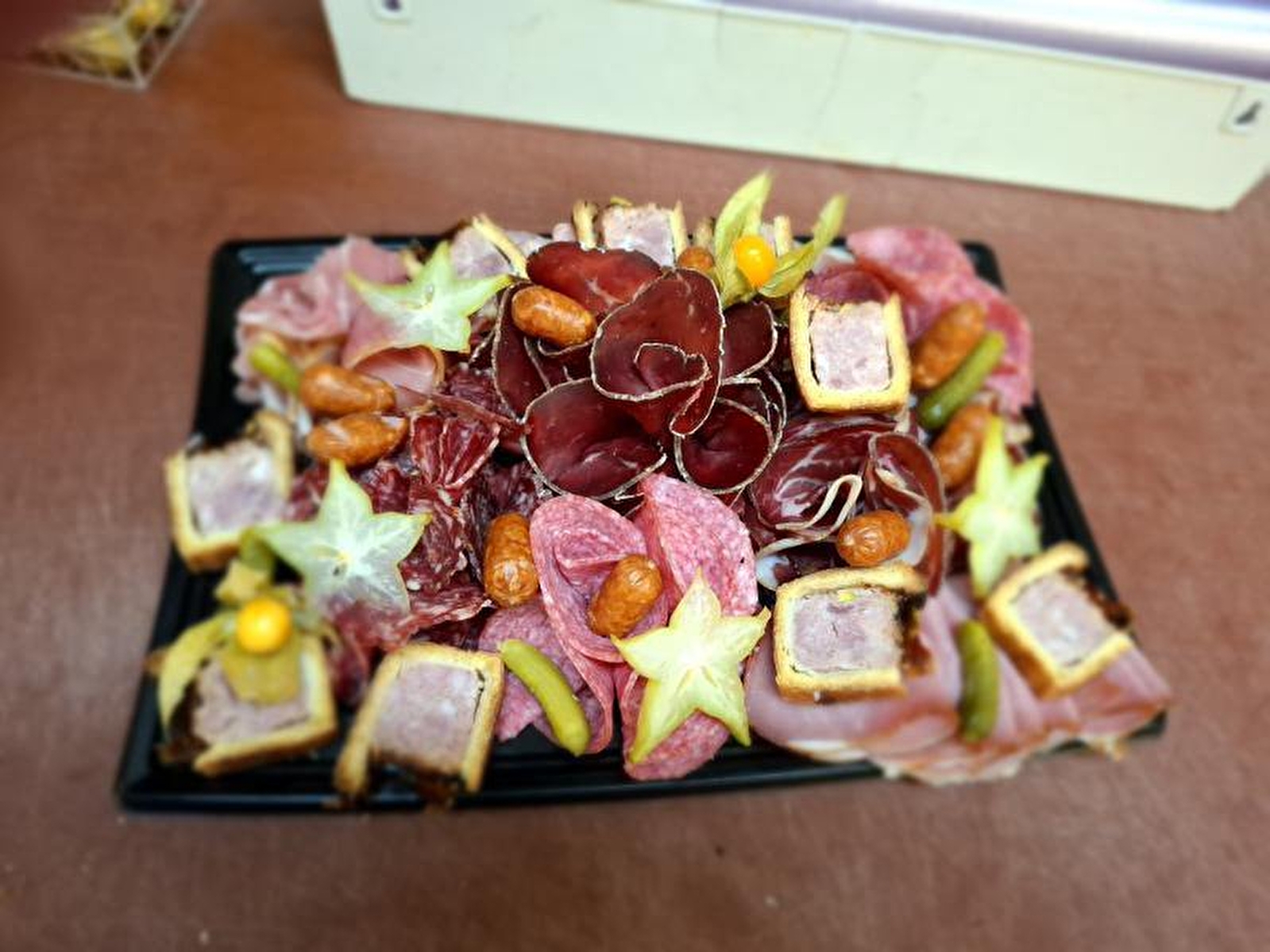 - Hausgemachte und mit Medaillen ausgezeichnete Wurstwaren: Lassen Sie sich von einer breiten Palette an Wurstwaren verführen, die vor Ort unter Einhaltung traditioneller Rezepte zubereitet werden. Unsere Produkte werden regelmäßig mit Preisen ausgezeichnet, wie unsere Blutwurst, die mit einer Goldmedaille (2019) ausgezeichnet wurde, oder unsere Kopfpastete, die eine europäische Trophäe gewonnen hat. Probieren Sie auch unsere ikonischen Rezepte wie die Terrine grand-mère oder die Rillettes comtoises.